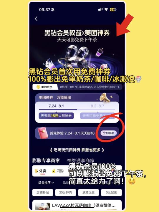 🌈不得不佩服说,美团会员这波操作真的赢麻了好吗!! 8月2日-8月7日,每人每天都可以领到免费神券!黑钻会员首张神券100%膨免费下午茶!其他会员也有大机会可以膨出咖啡、奶茶、冰淇淋,想想就美!