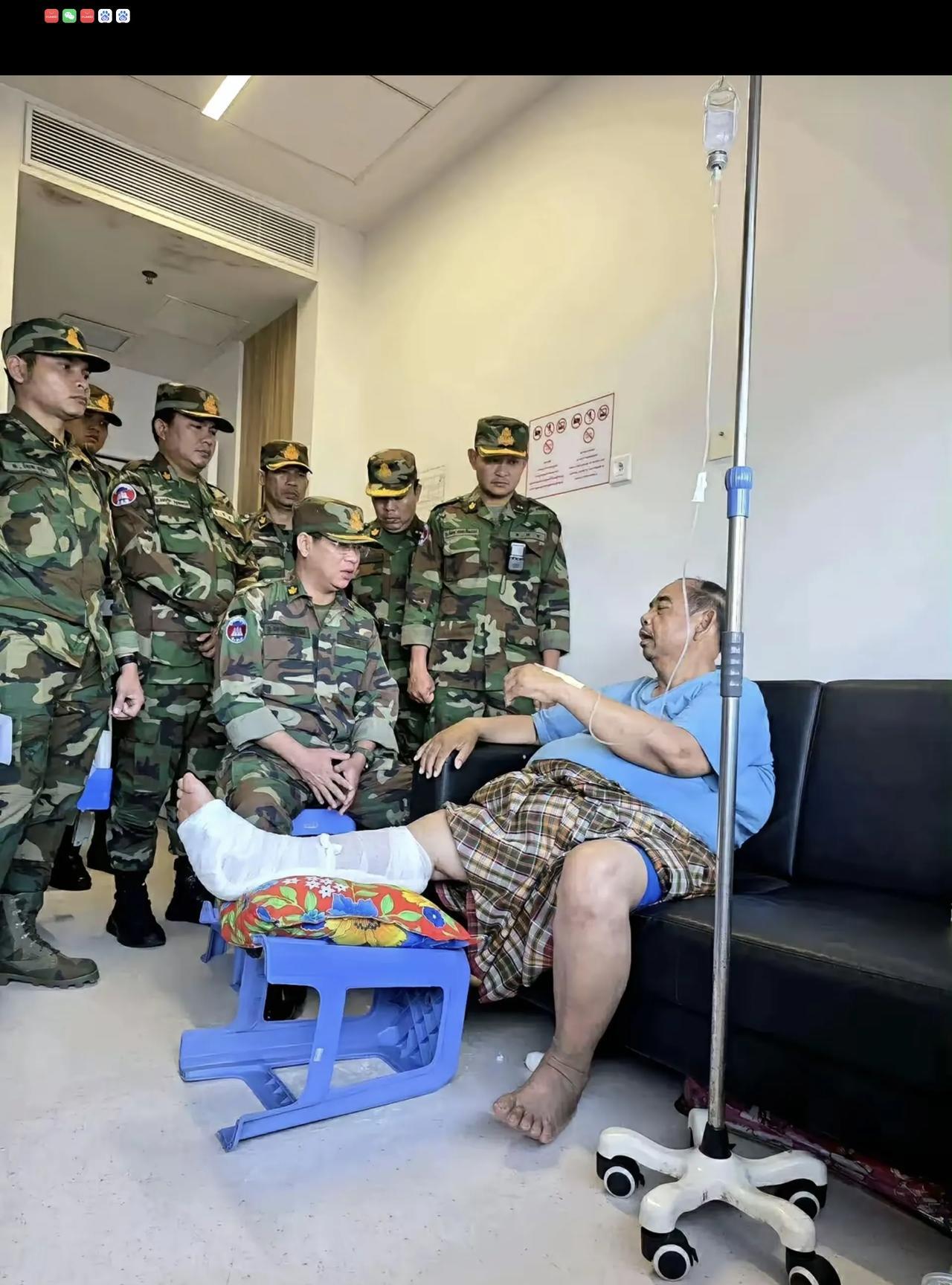 一开始看到照片,还以为是一个农民在医院看病。 然后,仔细看了文字解释:这是柬埔寨的陆军副司令(中将军衔),因在柬泰边境冲突中被泰国打过来的炮弹炸场了腿部,正在医院接受治疗。 哈哈哈,柬埔寨这个陆军副司令估计从来没有跑过早操,不然不应该肚子挺拔到这个程度。 当然,也许是天天喝啤酒喝出来成啤酒肚?