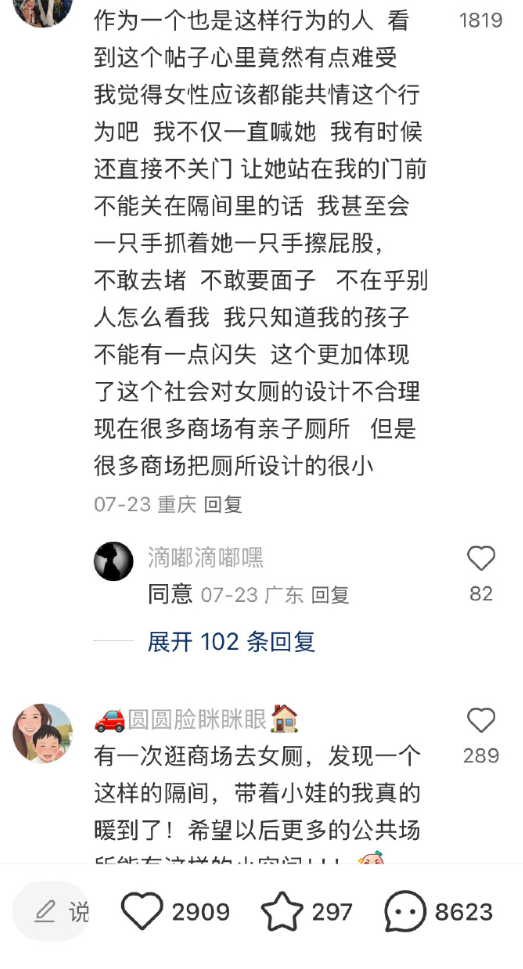 女孩子的话就一起进去母女共用一个厕所无所谓的,男孩子的话就得守着