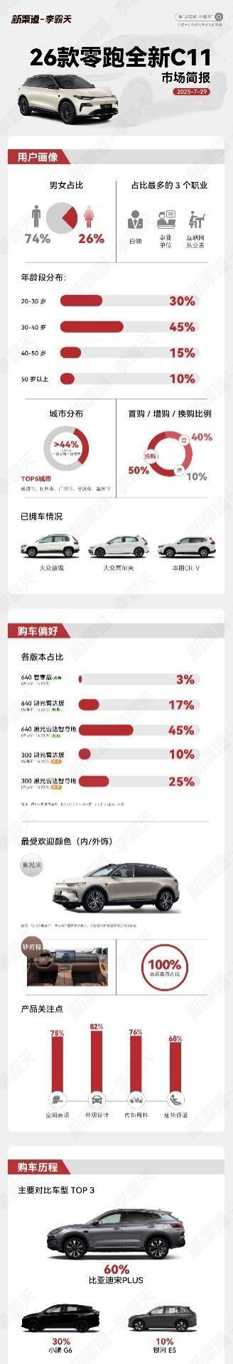 零跑月销首破5万大关,新势力真是越来越强势了! 今天,各大新势力相继公布了7月份的销量,其中零跑首次突破5万大关,交付量达到了50129台,稳居新势力第一,强势拿下5连冠,正在加速朝着累计百万销量大关迈进。 零跑销量能持续走强,今年发布的多款新车作用明显,就比如全新C11,在上月10日正式上市,14.98万的起售价再加上六大上市好礼和四项免费终身质保,迅速延续了车系的热销势头,累计定单已经突破万台,并且即将开启大规模交付。 而且根据全新C11的大定画像显示,40岁以下人群占比达到了75%,而且近半用户都来自一线以及新一线城市,这说明全新C11已经成为了大城市年轻人购车的首选之一。 另外,还有45%的用户选择了640激光雷达智尊版,有近半用户选择顶配,说明全新C11的高价值配置得到了普遍认可,不像有些车顶配只是用来提高价位,真正卖的是中低配。还有就是有60%的用户在购买之前对比过宋PLUS,这也说明全新C11已经具备了和主流新能源车型同台竞技的实力,是对零跑相当高的认可。 可以说,待C11大规模交付开启,接下来零跑很可能会持续稳定月销持续5万+! #零跑汽车##零跑C11##造车新势力##零跑汽车7月交付量突破5万辆#