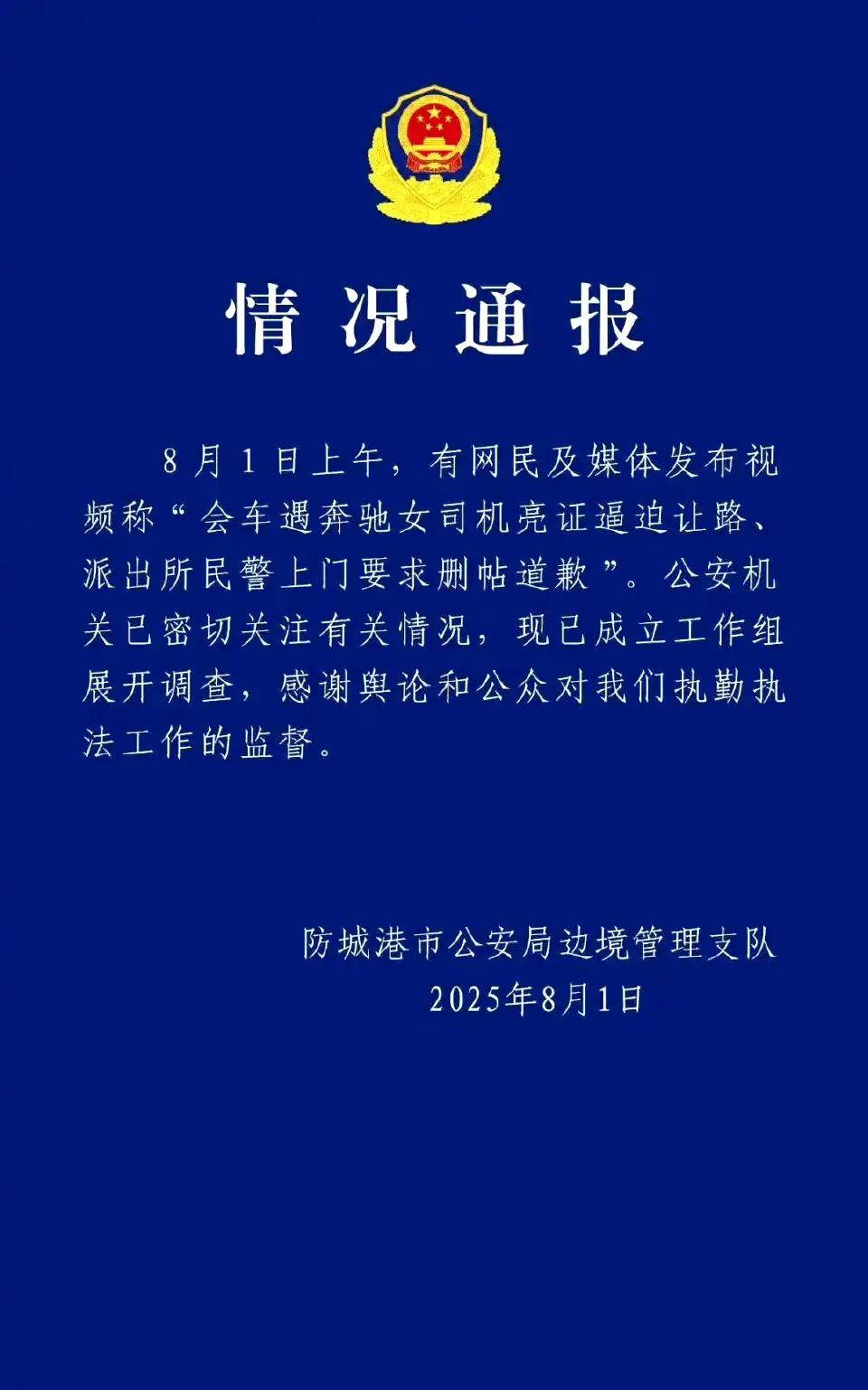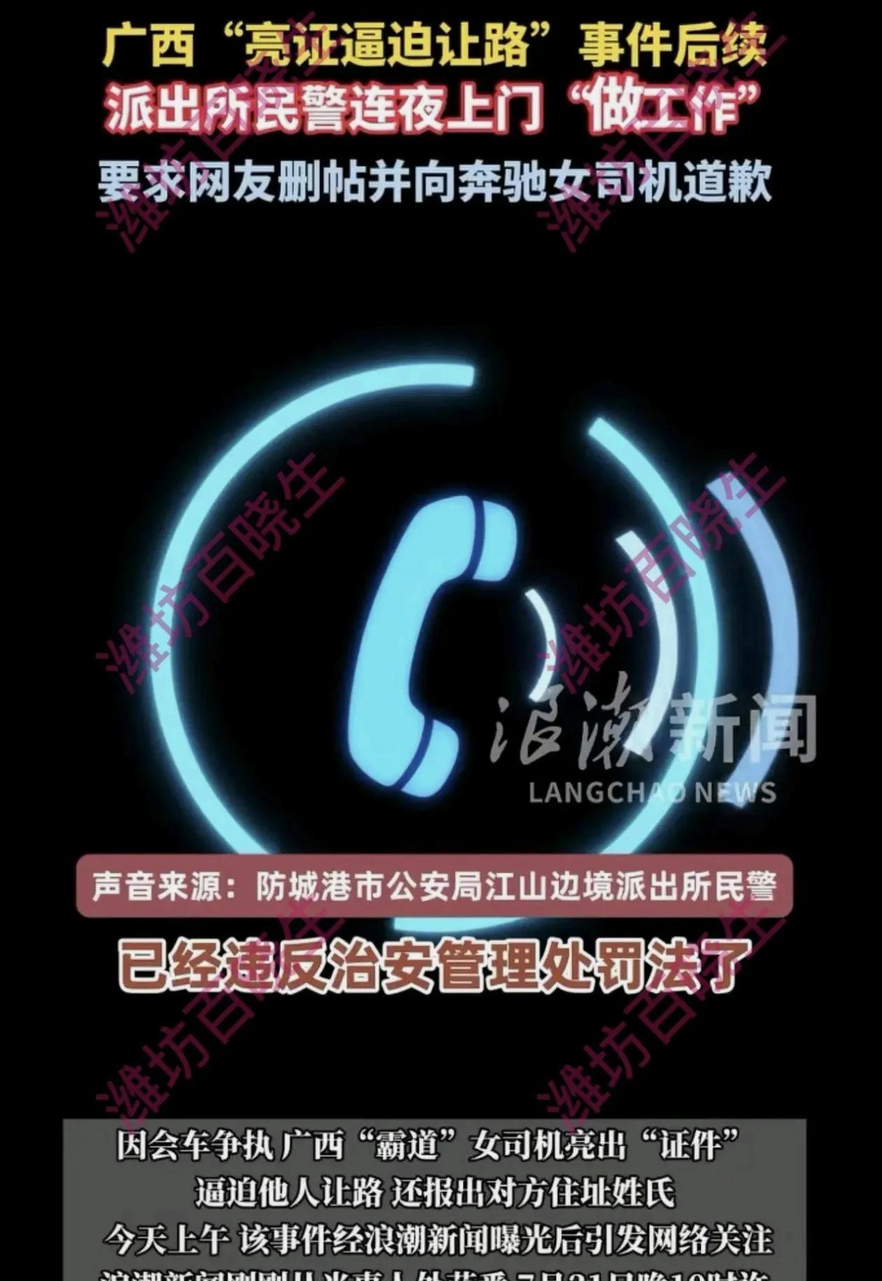 近日,广西防港地区发生了一件令人恐惧的事。一条狭窄的道路上两辆相遇,这种事互相让让也就过去了,结果其中一辆奔驰车的女司机下车,要求对头的男性司机让路,并表示如果不让就亮证。从女子拿出的证件封面上来看,好像是什么行政机关。更离谱的是,还能当场报出男司机的个人信息,包括家庭住址等,太可怕了吧。 事后男性司机就把拍到的视频发到网上,因这位奔驰女司机态度确实有点嚣张,而且看她的样子好像是公职人员,这种滥用职权的行为迅速引起了关注。让人没想到的是,视频在网上引起舆论后之后,就有帽子叔叔连夜找到男子父母家,不仅要让男子删除视频,还要求他向女司机道歉。男子迫于压力,发视频公开向那位奔驰女司机女子进行了道歉。 一个女司机,一本证件,精准报出对方住址姓名,再加上事后的上门“拜访”,这已经不是简单的对错问题了,失控的权力让人感到恐惧。我们从小的教育里有息事宁人,但这一件件的事,息事宁人换来的是对方的变本加厉,要承受更大的痛苦或代价。有理走遍天下,凭什么要让人退一步海阔天空,往后再也不会忍气吞声了。