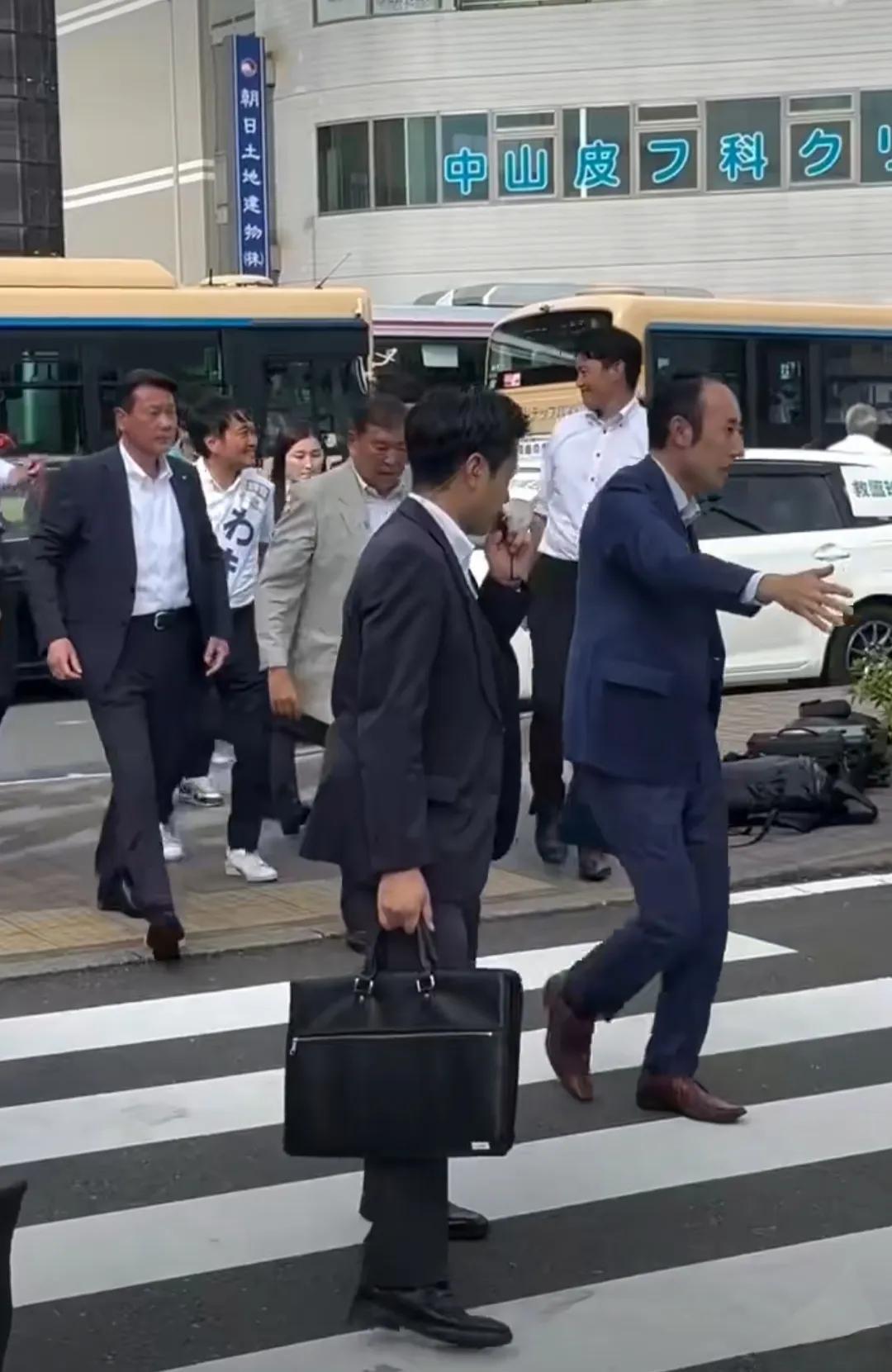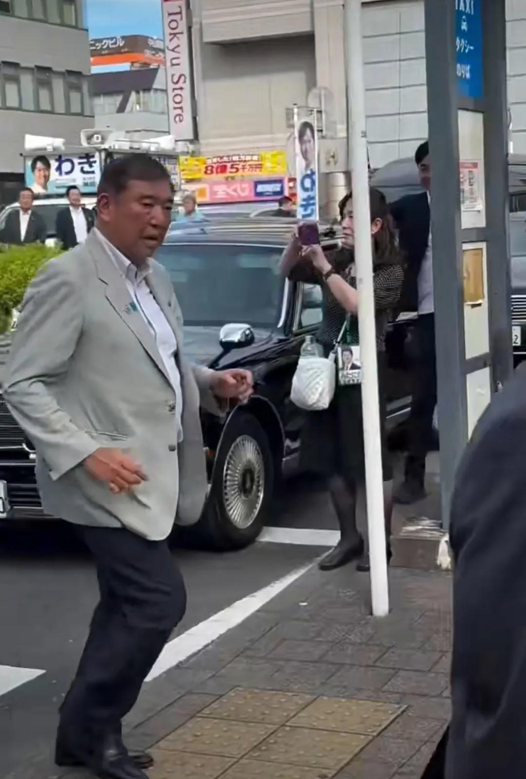 石破茂招摇过市 石破茂首相上街,专门有一个人打着旗跟着,生怕别人不知道首相来了,