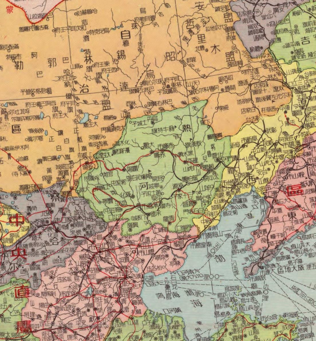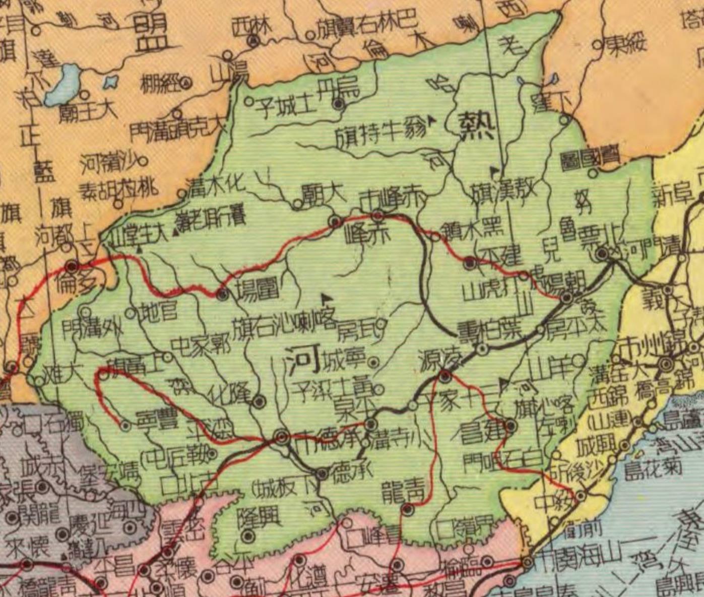 你用的这个地图是解放以后的热河省图,民国时没有内蒙自治区,西面很大部分属于热河到与外蒙接壤,北边的省界也不是西拉木伦河,而是分水岭