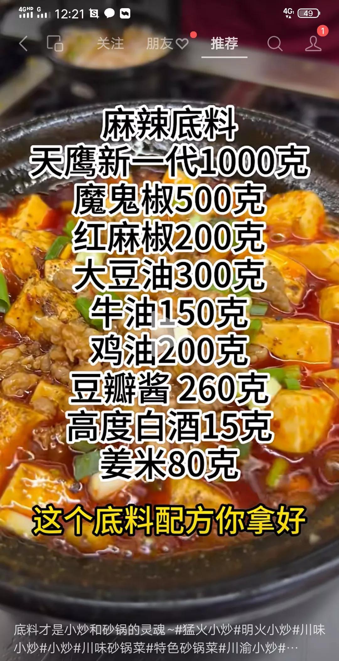 红麻椒50克, 香叶30克, 小茴香35克, 香砂30克,打磨成粉,加入下列麻辣底料里。 麻辣底料 魔鬼辣500克, 红麻椒200克, 大豆油300克, 牛油150克, 鸡油200克, 豆瓣酱260克, 高度白酒15克, 姜米80克 天鹰新一代1000克。