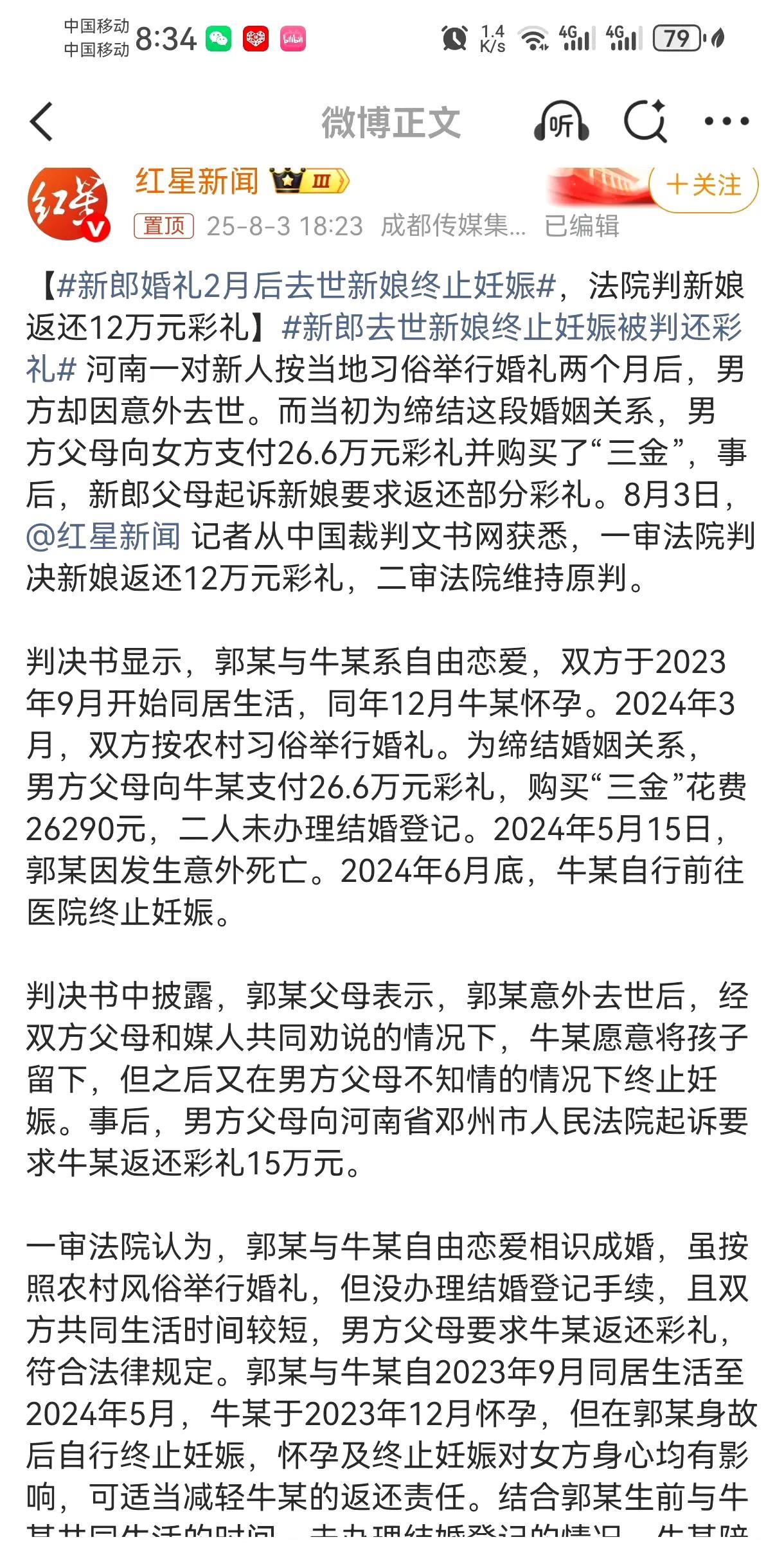 8月3日新郎结婚2个月意外去世,新娘打掉六个多月孩子。还和男方父母因为26.6万彩礼打官司。很多网友感觉终止妊娠是对的,是新娘自己的选择,孩子生出来也受罪没爸爸,而且新郎和新娘只是办仪式并没有领结婚证。新娘还不是二婚,不生孩子,以后还能当一婚。 但是有点不顾情面的打掉孩子,主要还答应媒婆和男方父母生下孩子,自己却悄悄打掉孩子。 只能说女子选择吧,既然孩子都打掉了也没领结婚证,公公和婆婆要一部分彩礼也正常。儿子都死了,钱被儿媳拿走老人养老怎么办,法院判决也很公正给公婆12万,女子自己留14万多,还有三金。 女子虽然伤心,但是这十几万两个月结婚才,还流产伤身体,补偿也应该。