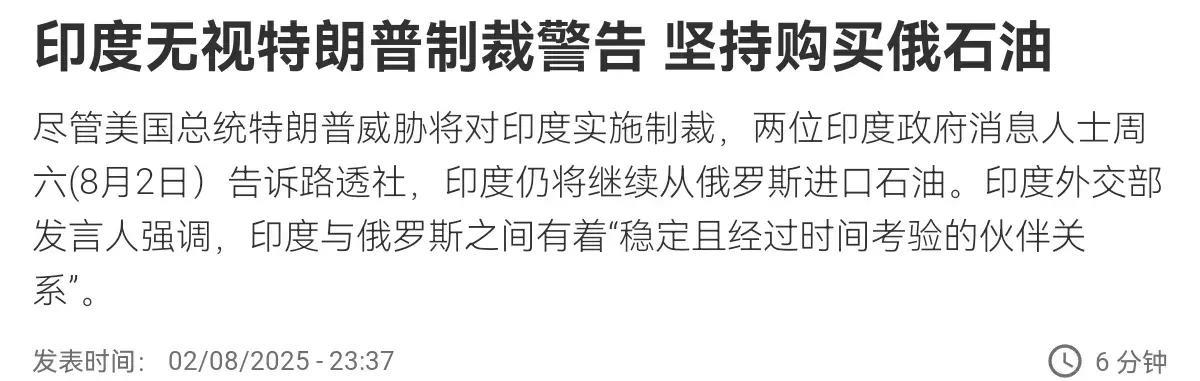 来自外媒8月3日消息说,印度方面正式表示,不会停止从俄罗斯进口石油,因为印度与俄罗斯之间的伙伴关系非常坚定。 可以说,这是印度方面针对美国要求停止购买俄罗斯能源的要求,做出的最新强硬喊话,也进一步亮明了印度的态度。 只是印度如此强硬,也让美国非常头疼,更是万万没想到啊。 一直以来,印度还是比较听从美国的安排的,但这次印度如此强硬,就是因为美国的要求触及了印度的底线。 对于印度来说,能源问题是生死存亡的大问题,如果不从俄罗斯进口,印度损失将非常惨重。所以,印度现在决定不再听从美国的要求,而是选择了下面硬刚。 现在,美国则不得不面对来自印度的反制。