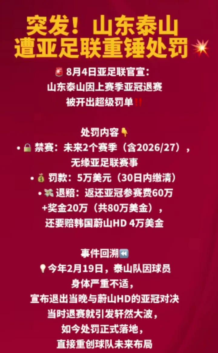 山东泰山遭遇亚足联重磅罚单,为上赛季亚冠事件买单,不单罚款89万美元,未来两个赛
