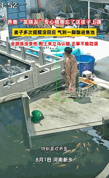 “这下后悔了吧!”8月1日,河南新乡,一男子坐在池塘边喂鱼,妻子突然喊他送小孩上学,由于太投入,男子并没有听到,不料,妻子也是个暴脾气,直接走过去一脚将男子踹进池塘!男子非常狼狈的爬了上来,给妻子道歉后就送孩子去了。网友:幸好养的不是鳄鱼! 这年头,谁还没有点爱好呢,不过,不管什么爱好都不能耽误了正事,不然就只会适得其反。 这天中午,杜先生吃过饭后便坐在院子里的池塘边,细心投喂着鱼食。这两池子的鱼可是杜先生的心血,先是在院子里挖了两个大池塘,然后精心挑选鱼苗,并将它们养大,你让他不吃饭可以,但绝对不能饿着鱼。 过了一会儿,快到孩子下午上课的时间了,妻子便让杜先生抓紧收拾下,送小孩去上学,不料,连喊了他好几声都不为所动。 妻子火急火燎的走过来,一脚将杜先生踹进了池塘,这下可着实把鱼给吓了一跳,杜先生也没反应过来,呛了几口水后游了上来,随后挣扎着爬上岸。 知道自己做错了事,杜先生急忙给妻子道歉,然后就带着孩子上课去了。 有网友看后表示,自己也喜欢养鱼,但家里人不同意,真羡慕杜先生有两个这么大的池塘,相信他妻子也很支持他! 大家对于这件事是怎么看? 信息来源:《养鱼发烧友专心喂鱼忘送孩子,妻子多次提醒没回应,一脚踹进鱼池》星视频
