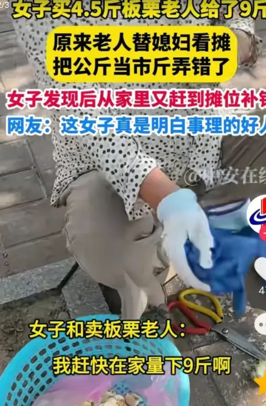 8月3日,安徽六安,一名女子在路边买了4.5斤板栗,在回家的路上越想越不对劲,4.5斤的板栗怎么这么沉!女子回家称了一下,居然是9斤板栗。