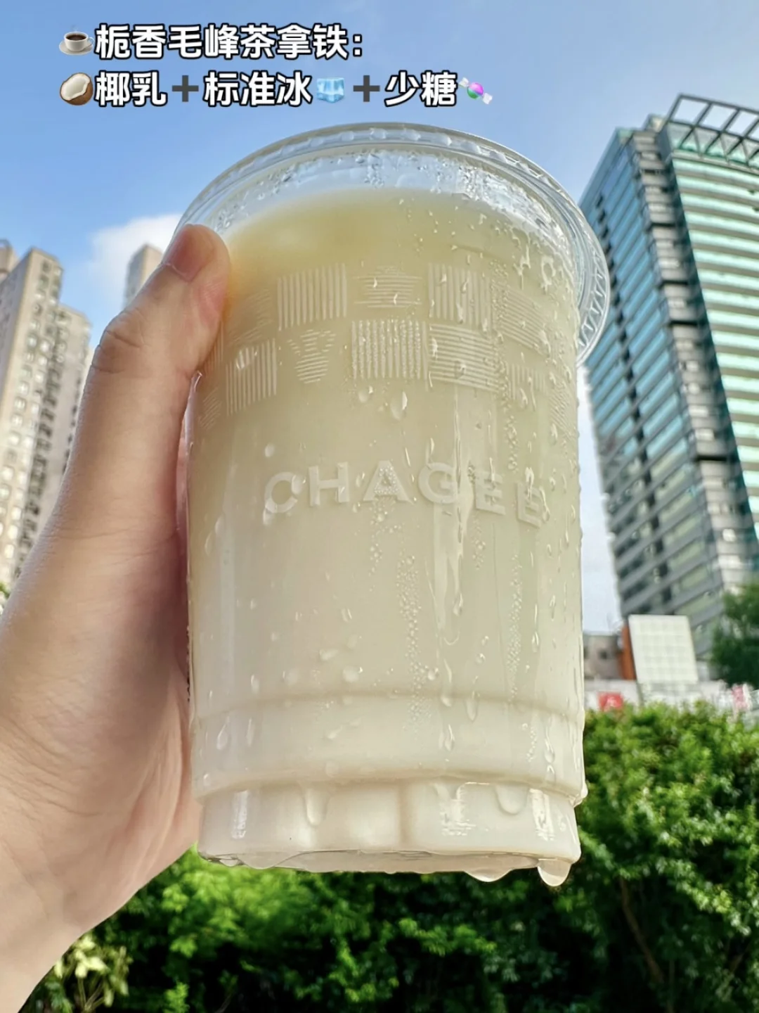 ☕️栀香毛峰茶拿铁: 🥥椰乳➕标准冰🧊➕少糖🍬