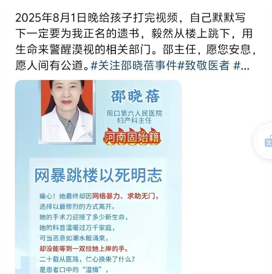 人类,是参差不齐的,有的人,品性高洁无上限,也有的人,行径卑 劣无下限。 谁也没有资格去指责一个长期承受网 暴的人内心脆弱,因为你们都没有经历过。 我昨天刷到一位懂心理学知识的网友,他在23年就感觉到 樊振东的状态、心理可能出现了一些问题。 但是那个时候,东子没有开通社交平台,所以这位网友尝试联系了樊振东身边的朋友。 这位网友当时就说,并不是樊振东太敏感了,而是在那一年里,他的价值观一次次受到了冲击,他一直坚信的东西,让他无法再信任、再有安全感,也因为他没有得到来自团队的庇护。(当时忘记截图了,如果后面再浏览到补上。) 前两天热搜的周口那位女医生,大家应该都看了。 她拼尽全力抢救下了一位羊水栓塞的产妇,但是,在抢救的过程中,这位产妇被切除了子宫,未来不能再生育。 没有感激,尽管当时的手术知情、同意书清清楚楚,她却遭至产妇本人及家人线上、线下无底线的网/暴。 我相信,所有对生育知识有所了解的人,都知道羊水栓塞有多凶险! 毫不夸张地说,救回一条羊水栓塞产妇的命,够吹一辈子了! 然而,这位产妇及婆家人因为她失去了子宫,因为她生的是一个女婴,因为他们花了50多万娶的媳妇不能再生儿子,在他们看来绝了后。 于是,她们连续7个月,在各大网络平台辱 骂、污 蔑这位医生,线下一次次投诉、去医院闹腾。 因为在他们的认知里,羊水栓塞根本救不活,连刘强东的妹妹不缺钱、不缺医疗资源,都没有救回来。 既然自己被救回来了,说明就不是羊水栓塞,在不是羊水栓塞的情况下,她却被切除了子宫。 一个不能再为家里延续香火的儿媳妇,还不如死 在手术台上! 所以,他们要求医院和这位医生赔偿100万。 除了这家人的无知、愚 蠢和恶 毒,让人寒心的,还有作为专业部门的医院和卫 健委以及执法部门。 面对一次次医闹的家属,压力已经到了极致的医生,医院也只是说,可以走法律途径。 而执法部门,在她第一次报警的时候,并未给予立案。 第二次报 警虽然立案了,但并未告知要如何解决。 以及这些网络平台,任由污/蔑、网/暴他人的信息传播了7个月。 不作为的医院,不作为的派出 所,不作为的媒体平台,让这位女医生失去了最后一根救命的稻草! 在不堪重负之下跳楼,选择了以死明志。 我想,但凡有人为她遮点风,挡点雨,可能都不至于此。 带着绝望离开的当天,她还做完了六台手术,安排好了交班工作。 并详细写下了事情的经过,给家人留言,一定要帮助她证明清白。 很惋惜,也很心痛,做出这个决定的时候,她一定满腹委屈。 出事之后,她收到了无数当年由她做剖腹产手术的宝妈们的认可和感谢。 但是,还有什么意义呢? 很多人不懂,他们觉得面对网/暴,你可以关掉网络,就当不存在,怎么会傻到去赔上自己的生命? 因为她受到的困扰不只来自线上,还有线下,她的车被泼油漆,被一次次作恶,她的生活和工作都已经被严重影响了。 因为,被冲击的、坍塌的,那是她——一个从医者最朴素的救死扶伤的价值观。 因为被破坏的,是她几十年累积起来的声誉,也是她最值得骄傲的羽毛。 而只有内心高洁之人,才珍爱自己的羽毛。 愿人间有公道,愿未来不止是竞技体育,所有人都拥有一个清清朗朗的网络环境! #头号创作者激励计划#