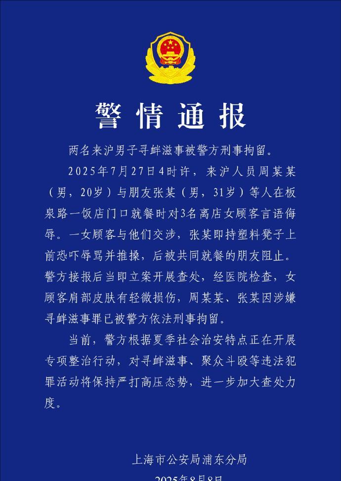 【#上海警方通报2男子饭店骚扰女顾客#:刑拘】#2男子饭店骚扰女顾客寻衅滋事被刑拘# 8月8日,@警民直通车-浦东 发布通报:两名来沪男子寻衅滋事被警方刑事拘留。2025年7月27日4时许,来沪人员周某某(男,20岁)与朋友张某(男,31岁)等人在板泉路一饭店门口就餐时对3名离店女顾客言语侮辱。一女顾客与他们交涉,张某即持塑料凳子上前恐吓辱骂并推搡,后被共同就餐的朋友阻止。警方接报后当即立案开展查处,经医院检查,女顾客肩部皮肤有轻微损伤,周某某、张某因涉嫌寻衅滋事罪已被警方依法刑事拘留。