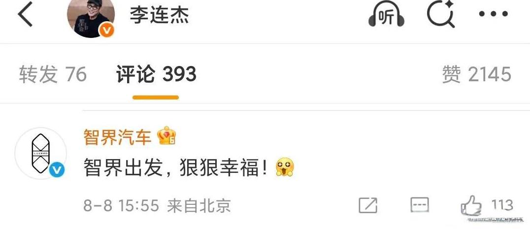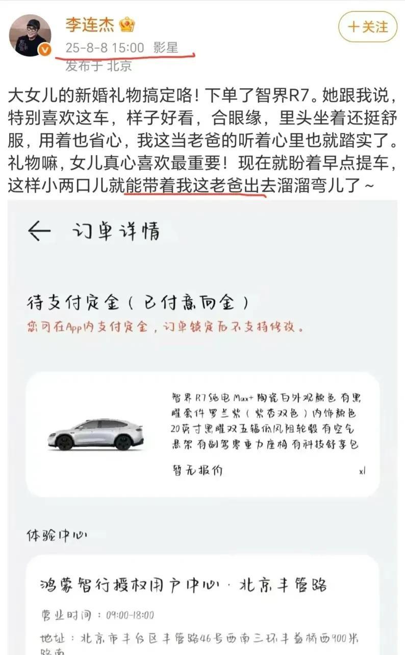 李连杰的大女儿要结婚了,作为父亲,李连杰送给她的新婚礼物是一辆新款智界R7。 新款智界R7今天开启预定,就在李连杰的发文下,智界汽车评论了一条,双向互动,这怕是软广吧? 李连杰说的大女儿应该是跟黄秋燕生的李思,因为他曾经抛妻弃子,父女俩关系不怎么好,这是和解,女儿原谅父亲。#头号创作者激励计划#