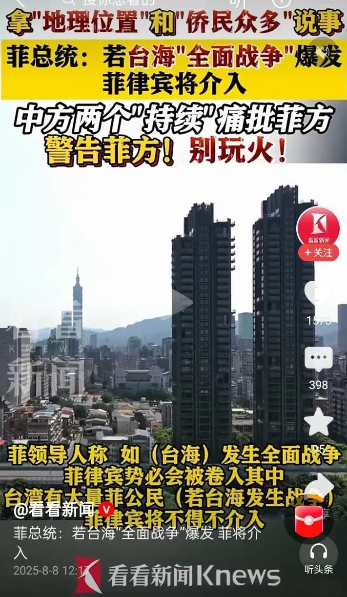 菲总统喝多了,最少喝了二斤,少一两都说不出这种“醉话”。 近日,菲律宾总统,为了讨好他大哥,再次拿台海问题说事,他说:“若台海“全面战争”爆发,菲律宾将介入。”还拿“地理位置”和“侨民众多”说事。 小菲这是打算一条道路走到黑,坚决的走在“反华”第一线,真是不知道他们的领导人天天喝多少,我觉得正常人没有这反应,他难道还认为现在是100年前?真是不知所谓。