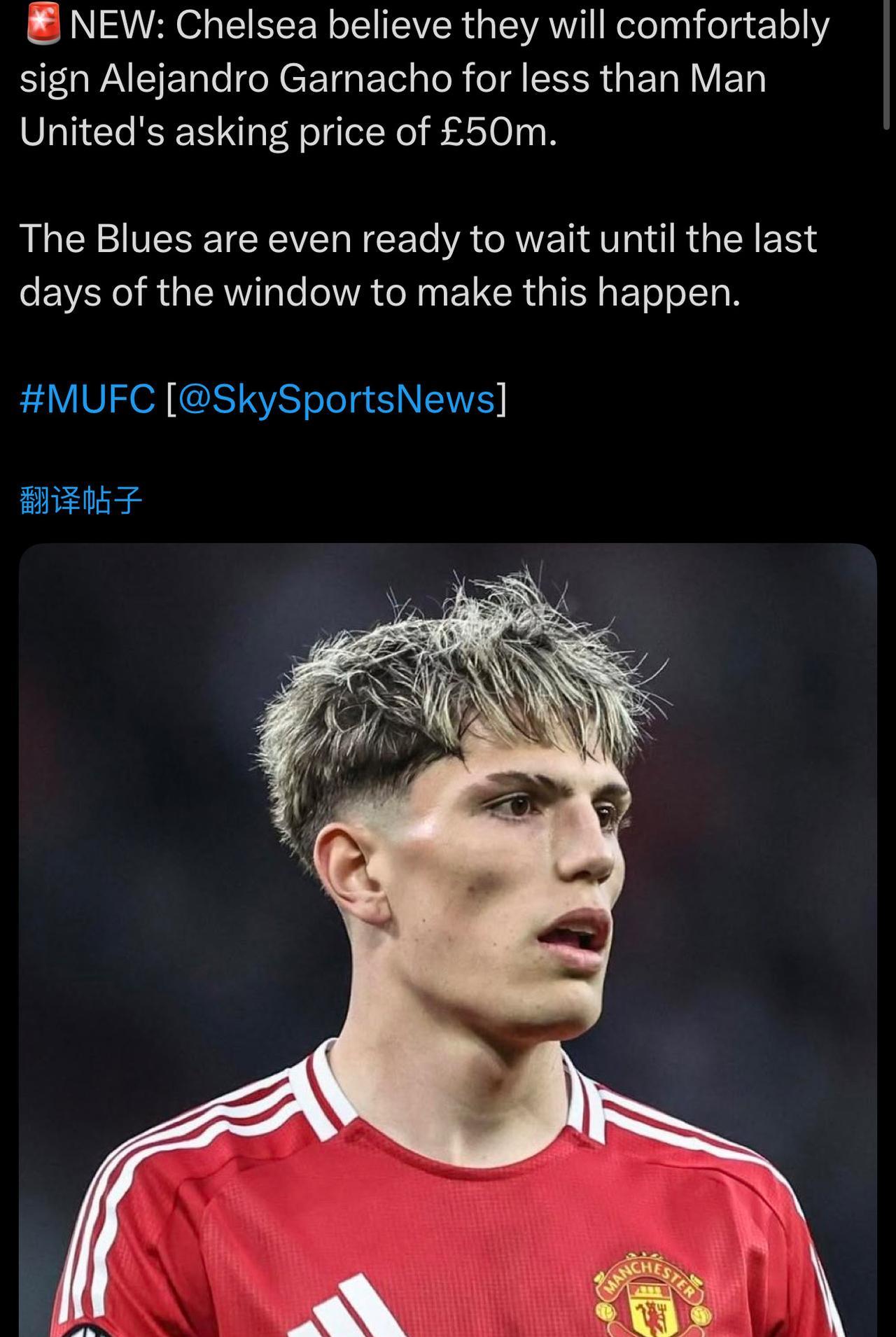 切尔西相信他们可以轻松地以低于曼联5000万英镑的要价签下加纳乔。