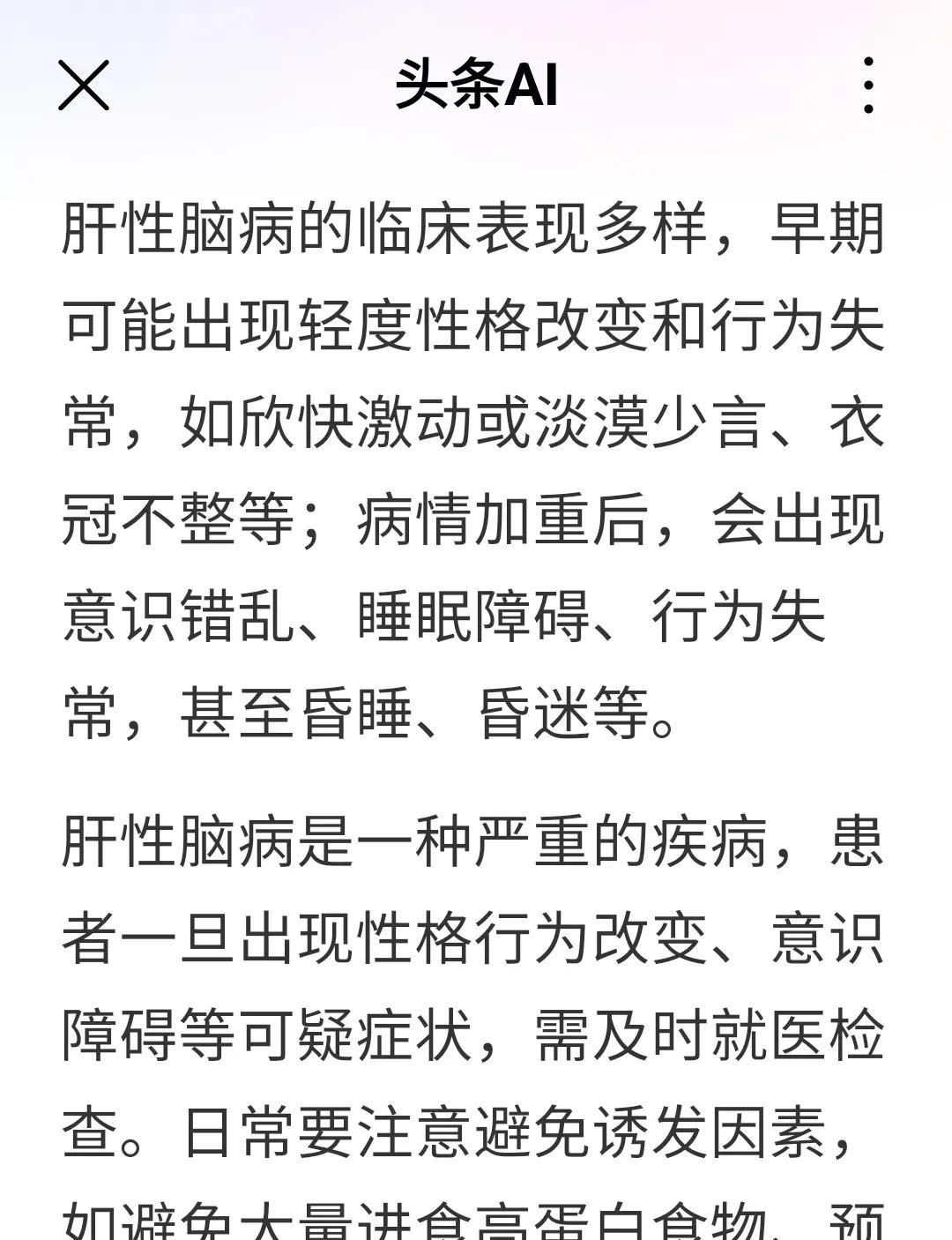 “查它干嘛。” “我今天头难受的厉害,带着后脖子后背都疼,感觉是不是肝性脑病呀。