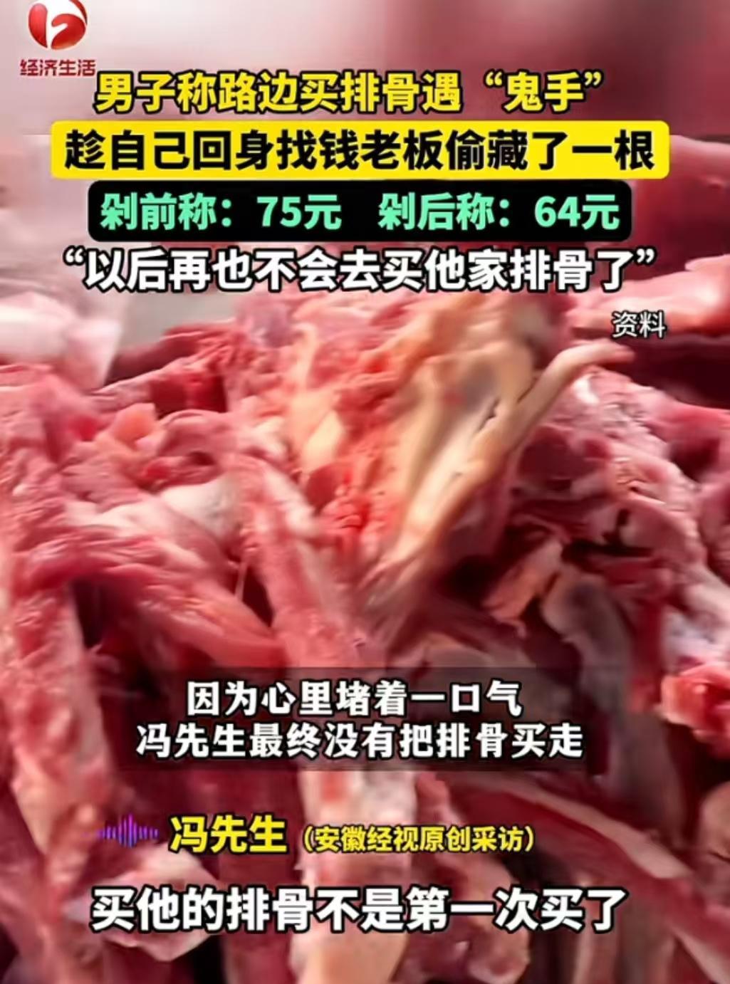 安徽利辛,男子将车停在路边买排骨,称好后一共75块钱,摊主剁排骨的时候,男子扭头拿现金,结果偶然一回头,看到摊主将一根排骨扔回摊上。男子认为摊主扔回去的是自己的排骨,要求摊主将剁好的排骨重新称重,摊主百般推脱,最后实在推不过了,才重新称了一下,结果原本75元的排骨变成了64元。 “趁我不注意就耍这小聪明?这不是明着坑人嘛!以后再也不买他家排骨了!” 冯先生(化名)愤怒的声音,揭开了一场买排骨时遭遇的糟心事儿。 据AHTV第一时间7月28日发布,冯先生平时在家不咋做饭,都是妻子做,这天妻子让他下班买点排骨带回来煲点汤喝,于是他来到菜市场。 挑好排骨,冯先生准备去车里拿现金,可就是这一扭头的工夫,偶然回头的瞬间,他瞥见摊主将一根排骨扔回了摊上。这一眼,让冯先生心里七上八下的,直觉告诉他,被扔回去的那根,大概率是自己买的排骨。 原来,冯先生为了买排骨方便,就把车停在路边,路边肉摊的排骨看着新鲜,他便选了些,称好后总价 75 元 。接下来,摊主开始剁排骨,冯先生想着刚好车里还有点现金,一直花不出去,于是他去车里想拿现金付款,就扭头去拿。 结果就发现了摊主耍小聪明的一幕。冯先生越想越气,要求摊主将已经剁好的排骨重新称重。摊主一开始百般推脱,似乎想把这事儿糊弄过去,可冯先生态度坚决,摊主实在没法继续推脱,才不情不愿地重新称重。这一称,原本 75 元的排骨,居然变成了 64 元 。 老板却还狡辩,是自己不小心碰着了,但这些谎言冯先生才不信,最后,冯先生因为心里有气,买的排骨直接不要了。他换了一家去买,店主给了足斤足两,回家后冯先生还告诉妻子,以后别去路边那家买排骨了! 这件事很快在网上传开,网友们纷纷发表看法。有人说:做生意最重要的就是诚信,这摊主耍鬼手,看似占了小便宜,实则砸了自己的招牌,以后谁还敢去他家买肉。 也有人分享类似经历:感慨街头买卖也得多个心眼,不然很容易被 暗箱操作,现在信息传播这么快,一点不诚信的事儿,分分钟就能传开,影响生意不说,还坏了自己在大家心里的形象。 诚信,是生意的根基。不管是街头小摊,还是大的企业,只有诚信经营,才能留住顾客。就像这卖排骨的摊主,一次不诚信的行为,让冯先生这样的老顾客都寒了心,以后断然不会再光顾。而且,口碑一旦坏了,再想挽回就难了. 同时,这也提醒消费者,购物时得多留意,别因为一时疏忽,让不良商家有机可乘。冯先生要是没偶然回头,发现摊主的小动作,可能就稀里糊涂吃了亏。当然,遇到这种情况,就得像冯先生一样,勇敢站出来维权,不能让不良商家逍遥自在。 对此你怎么看?欢迎大家在评论区留言讨论。 信息来源:AHTV第一时间