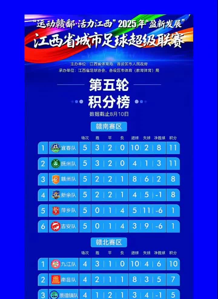 赣超第五轮结束了,这个积分榜有点意思,赣北赛区九江和南昌排第一和第二位,这个在大