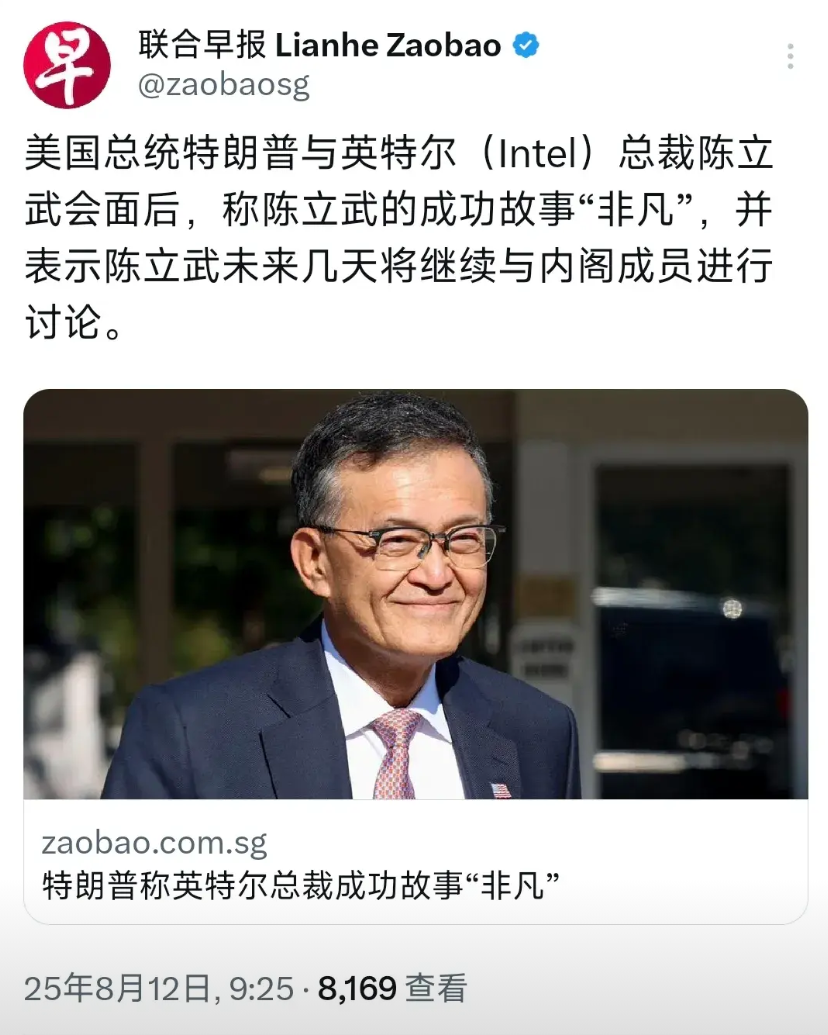 外媒今天(8月12日)报道:“美国总统特朗普与英特尔(Intel)总裁陈立武会面