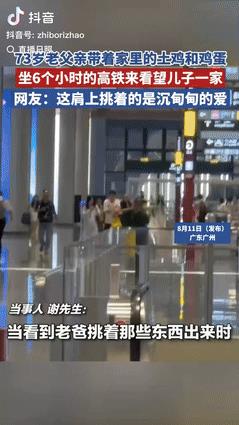 “眼泪止不住了!”广东广州一73岁老父亲,肩上挑着家里的土鸡和鸡蛋,坐6个小时的高铁来看望儿子一家,听到孙女叫他后,老人迈着小碎步朝儿子走去,儿子立马从父亲手里接过扁担,而他接下来的一番话,让人感动,网友:这肩上挑的是沉甸甸的爱! 一位73岁的老人肩挑扁担坐了6小时高铁,只为给儿子送去20斤自家土特产,当孙女在站台喊“爷爷”时,老人加快脚步的身影让整个候车厅的人都侧目张望。 儿子接过扁担时发现,父亲的肩膀早已被压出深深的红痕,而两个编织袋里装着15只土鸡、50个鸡蛋,还有自家种的青菜萝卜。 这位老人来自粤北山区,儿子大学毕业后在广州定居,因为工作繁忙一年只能回家两次。老人平时独自务农,养了30多只土鸡,种着一亩菜地。 这次出发前,他特意挑选了最肥的鸡,捡了当天最新鲜的鸡蛋,还连夜收割了刚成熟的蔬菜,因为东西太多太重,他翻出压箱底的扁担,这根竹制扁担已经用了20多年。 从村里到县城再转高铁,老人辗转了8个小时才到达广州南站,高铁上他全程护着编织袋,每次有人经过都会下意识地往里挪一挪。 列车员主动帮他把扁担放到行李架上,他连声道谢,却坚持把装鸡蛋的袋子抱在怀里,到站前半小时,他就开始收拾东西,生怕耽误其他乘客。 儿子算好时间提前到站台等候,还特意带着5岁的女儿一起来接站,小女孩远远看见爷爷就兴奋地跳起来喊,老人听到声音立刻转头寻找,看到孙女的瞬间脸上绽开了笑容。 儿子接过扁担时惊讶地发现,这些土特产按市场价计算超过800元,够全家吃半个月,老人却说:“城里买的鸡蛋没有土鸡蛋香,这些都是散养的,营养更好。” 城里人习惯用金钱和物质表达关怀,农村老人则更依赖实物和亲手制作。他们不相信超市里的有机蔬菜,只相信自己亲手种植的作物;不信任品牌鸡蛋的营养价值,只认可自家散养的土鸡蛋。 网友们也开始分享自己的类似经历:有人说母亲每次来看自己都要背一袋家乡的大米;有人说父亲专门学会了真空包装,为了给在外工作的女儿寄腊肉,这些看似"笨拙"的爱,恰恰是最珍贵的亲情表达。 在快节奏的现代生活中,我们或许需要学会珍惜这种“麻烦”的爱,当父母不辞辛苦地为我们准备家乡味道时,这份心意远比物品本身更有价值。 真正的孝顺不是给父母多少钱,而是让他们感受到被需要、被重视,有时候一个电话、一次回家、一句“我想吃您做的菜”,就能让他们感到无比满足。 网友评论: “看哭了!老一辈的爱就是这么实在,不搞虚的,有啥好的都想着孩子。” “我爸妈也是这样,每次回家后备箱都被塞满,明明城里啥都能买到,但他们总觉得自家的最好。” “这哪是土鸡和鸡蛋啊,这是老父亲满满的心意!现在的年轻人真的该多回家看看。” “我爷爷以前也是这样,扛着几十斤的菜坐大巴来看我,现在想想真后悔没多陪陪他……” 信源:直播日照 2025年8月13日