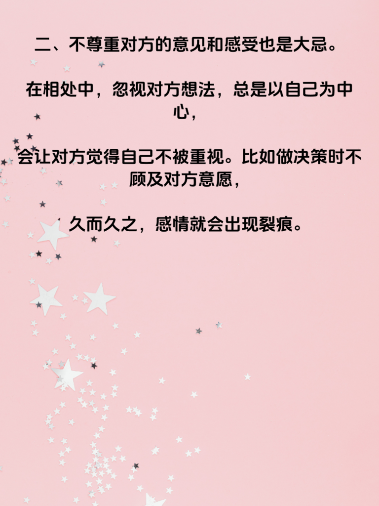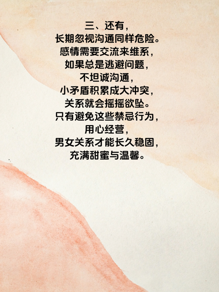 一、在男女关系中,有些行为就像隐藏的炸弹,一不小心就会引发关系破裂。首先,过度控制是一大禁忌。每个人都渴望自由与独立,当一方试图过度掌控另一方的生活,比如限制对方社交、规定行踪,会让对方感到窒息。 二、不尊重对方的意见和感受也是大忌。在相处中,忽视对方想法,总是以自己为中心,会让对方觉得自己不被重视。比如做决策时不顾及对方意愿,久而久之,感情就会出现裂痕。 三、还有,长期忽视沟通同样危险。感情需要交流来维系,如果总是逃避问题,不坦诚沟通,小矛盾积累成大冲突,关系就会摇摇欲坠。只有避免这些禁忌行为,用心经营,男女关系才能长久稳固,充满甜蜜与温馨。