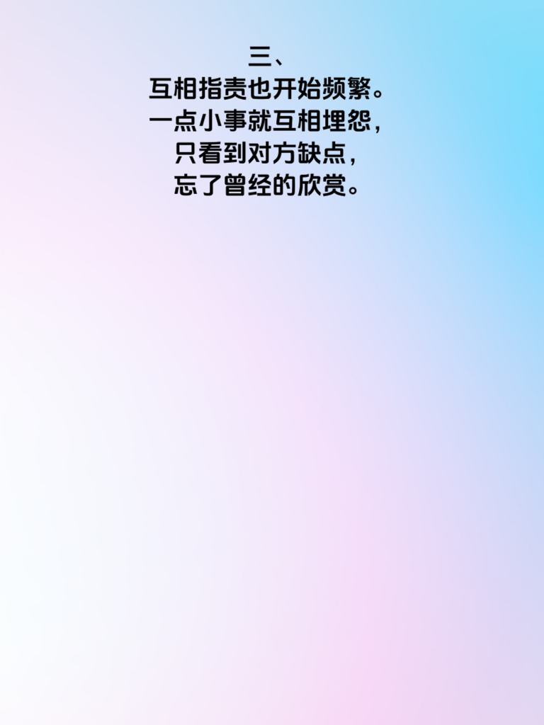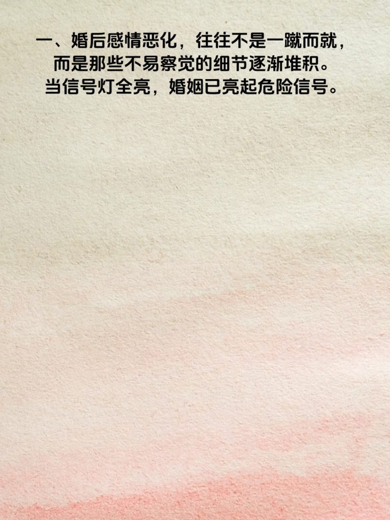 一、婚后感情恶化,往往不是一蹴而就,而是那些不易察觉的细节逐渐堆积。当信号灯全亮,婚姻已亮起危险信号。 二、沟通减少是常见问题。曾经无话不谈,如今却相对无言。每天交流寥寥,矛盾便在沉默中滋生。 三、互相指责也开始频繁。一点小事就互相埋怨,只看到对方缺点,忘了曾经的欣赏。 四、亲密感缺失同样致命。不再有拥抱、亲吻,身体距离近,心却远了。 五、面对这些,我们该怎么做?首先,重拾沟通,每天留些时间真诚交流。 六、学会换位思考,多站在对方角度想,理解对方不易。 七、还要找回浪漫,偶尔的约会、小惊喜,重燃爱的火花。婚姻不易,愿我们都能用心呵护,让爱长久。