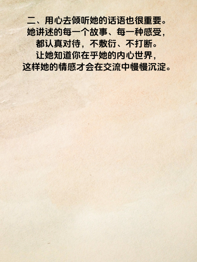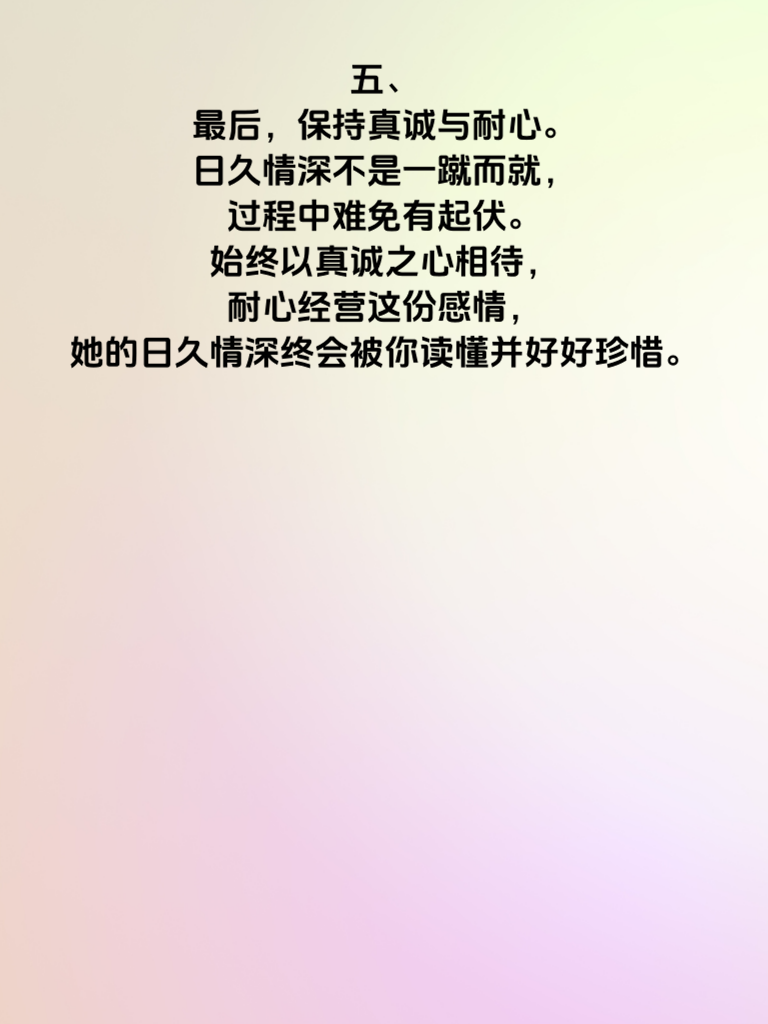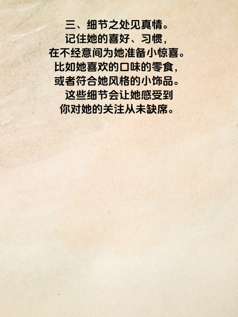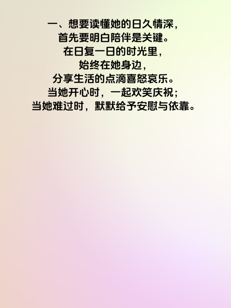 一、想要读懂她的日久情深,首先要明白陪伴是关键。在日复一日的时光里,始终在她身边,分享生活的点滴喜怒哀乐。当她开心时,一起欢笑庆祝;当她难过时,默默给予安慰与依靠。 二、用心去倾听她的话语也很重要。她讲述的每一个故事、每一种感受,都认真对待,不敷衍、不打断。让她知道你在乎她的内心世界,这样她的情感才会在交流中慢慢沉淀。 三、细节之处见真情。记住她的喜好、习惯,在不经意间为她准备小惊喜。比如她喜欢的口味的零食,或者符合她风格的小饰品。这些细节会让她感受到你对她的关注从未缺席。 四、尊重她的选择和决定。无论是工作上的抉择,还是生活中的小打算,都给予支持与鼓励。让她在你这里有充分的自由去做自己,她会因此更加信赖你,感情也会愈发深厚。 五、最后,保持真诚与耐心。日久情深不是一蹴而就,过程中难免有起伏。始终以真诚之心相待,耐心经营这份感情,她的日久情深终会被你读懂并好好珍惜。