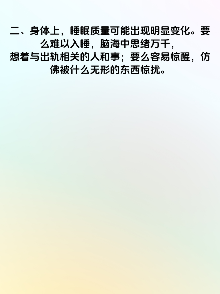 一、中年女性出轨,身体往往会提前预警。首先,在情绪方面,可能会变得比以往更加喜怒无常。原本温和的她,可能会频繁为小事发火,或者莫名陷入低落情绪,这背后或许隐藏着内心的纠结与不安。 二、身体上,睡眠质量可能出现明显变化。要么难以入睡,脑海中思绪万千,想着与出轨相关的人和事;要么容易惊醒,仿佛被什么无形的东西惊扰。 三、食欲也可能失调。有的可能突然暴饮暴食,用食物来填补内心的空缺;有的则可能茶饭不思,对曾经喜爱的美食失去兴趣。 四、还有身体的敏感度。可能对伴侣的亲密举动变得冷淡或抗拒,而对其他人一些不经意的举动却格外在意,这其实反映了她情感重心的偏移。 五、另外,她的日常习惯也会改变。比如原本规律的健身、读书等活动,可能会被频繁搁置,心思分散到其他地方。若能留意这些身体发出的预警信号,或许能及时发现婚姻中的问题,尽力挽回或妥善处理。