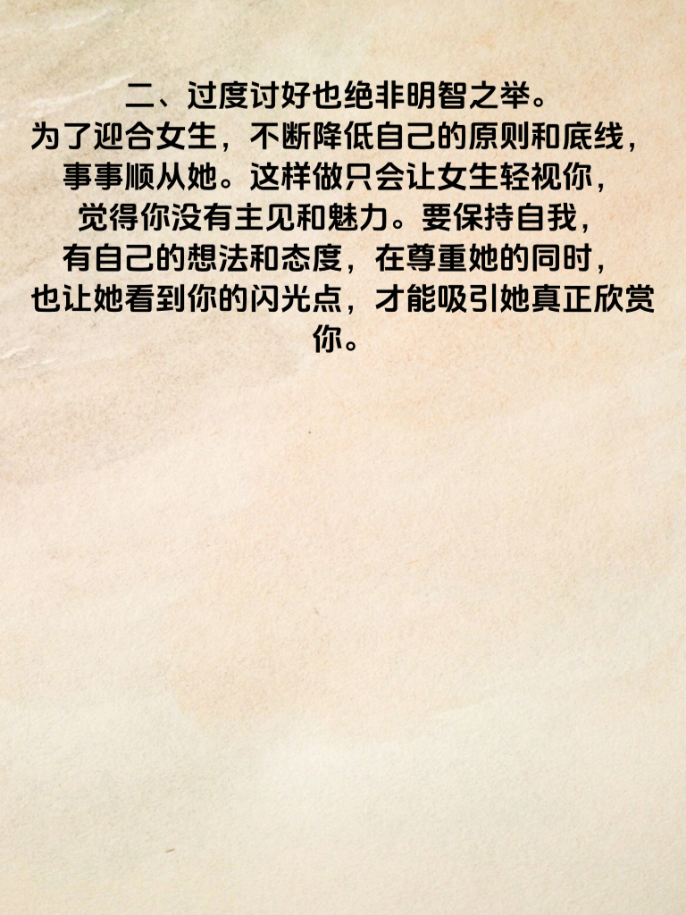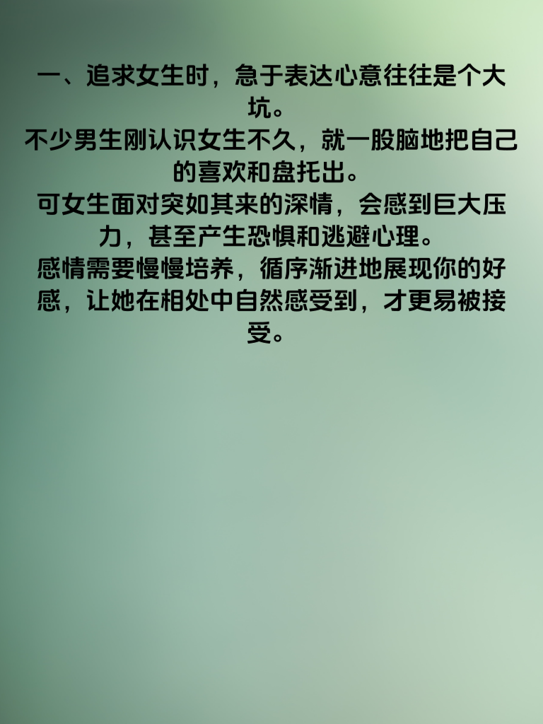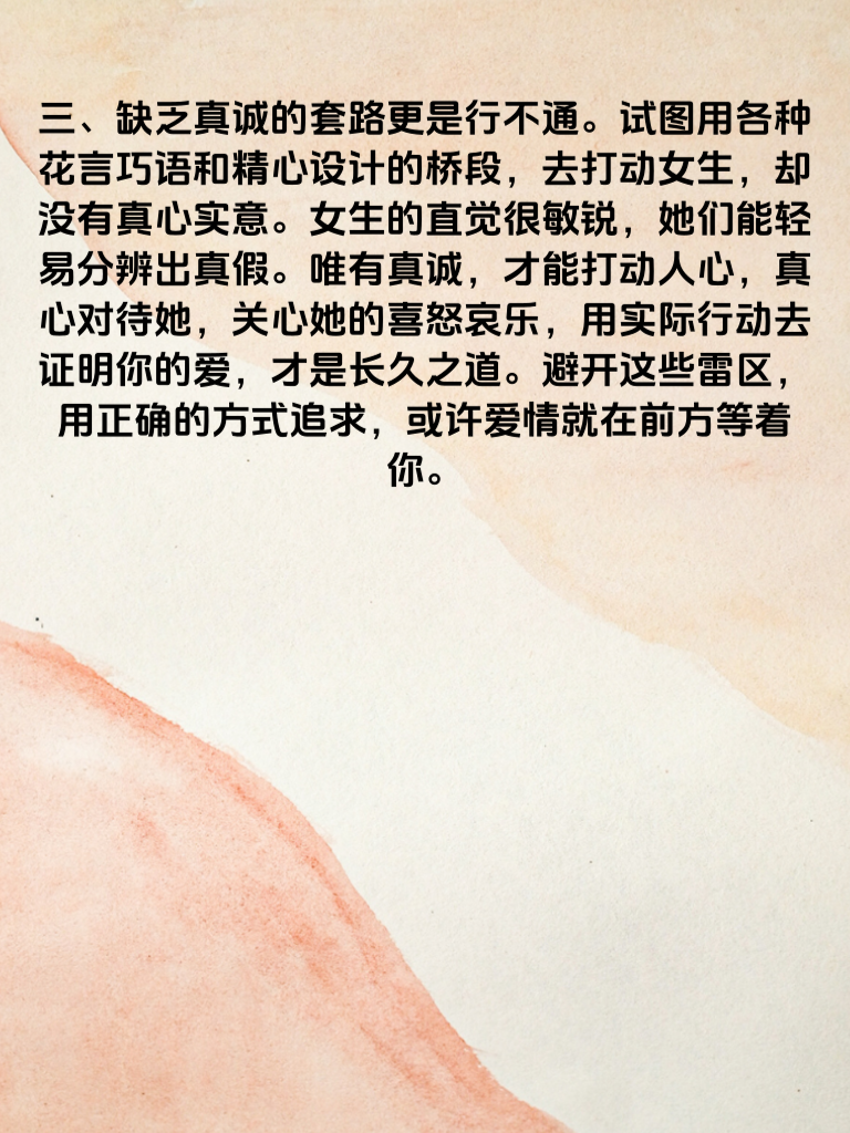 一、追求女生时,急于表达心意往往是个大坑。不少男生刚认识女生不久,就一股脑地把自己的喜欢和盘托出。可女生面对突如其来的深情,会感到巨大压力,甚至产生恐惧和逃避心理。感情需要慢慢培养,循序渐进地展现你的好感,让她在相处中自然感受到,才更易被接受。 二、过度讨好也绝非明智之举。为了迎合女生,不断降低自己的原则和底线,事事顺从她。这样做只会让女生轻视你,觉得你没有主见和魅力。要保持自我,有自己的想法和态度,在尊重她的同时,也让她看到你的闪光点,才能吸引她真正欣赏你。 三、缺乏真诚的套路更是行不通。试图用各种花言巧语和精心设计的桥段去打动女生,却没有真心实意。女生的直觉很敏锐,她们能轻易分辨出真假。唯有真诚才能打动人心,真心对待她,关心她的喜怒哀乐,用实际行动去证明你的爱,才是长久之道。避开这些雷区,用正确的方式追求,或许爱情就在前方等着你。