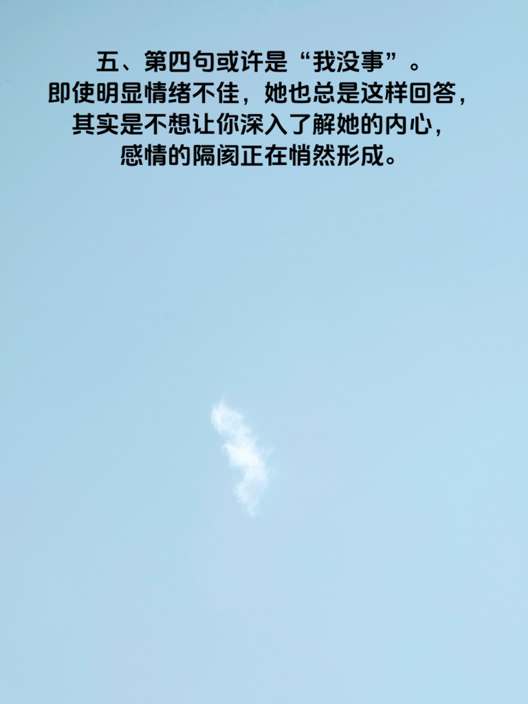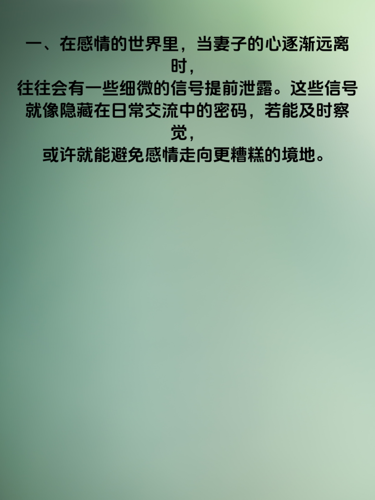 一、在感情的世界里,当妻子的心逐渐远离时,往往会有一些细微的信号提前泄露。这些信号就像隐藏在日常交流中的密码,若能及时察觉,或许就能避免感情走向更糟糕的境地。 二、第一句可能是“随便你”。当她对很多事情都表现出无所谓的态度,不再像以前那样积极表达自己的想法和感受,这说明她内心开始对这段关系有些懈怠了。 三、第二句也许是“别管我”。她开始抗拒你的关心,想要独自处理问题,这是她在情感上与你保持距离的表现。 四、第三句可能是“都一样”。无论是面对生活中的选择还是情感上的回应,她都觉得没什么差别,这反映出她对这段感情的热情在消退。 五、第四句或许是“我没事”。即使明显情绪不佳,她也总是这样回答,其实是不想让你深入了解她的内心,感情的隔阂正在悄然形成。 六、第五句可能是“嗯”“哦”等简单敷衍的回应。聊天时变得惜字如金,不再像过去那样与你畅所欲言,这都是妻子心已远离的危险信号。要多留意这些话语背后的情感变化,及时修补感情的裂缝。