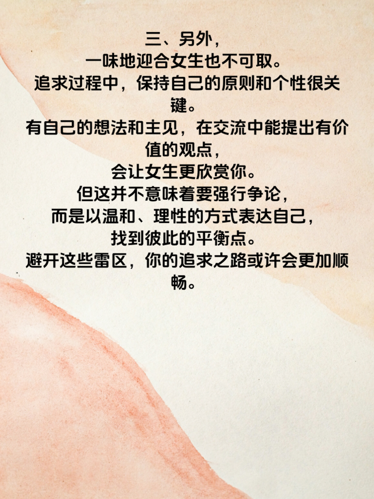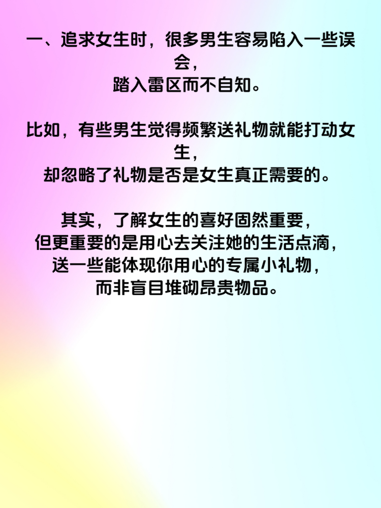 一、追求女生时,很多男生容易陷入一些误会,踏入雷区而不自知。比如,有些男生觉得频繁送礼物就能打动女生,却忽略了礼物是否是女生真正需要的。其实,了解女生的喜好固然重要,但更重要的是用心去关注她的生活点滴,送一些能体现你用心的专属小礼物,而非盲目堆砌昂贵物品。 二、还有的男生总喜欢在女生面前过度表现自己的优点,甚至吹嘘。要知道,真诚才是必杀技。适度展示自己的闪光点,同时也要坦然承认自己的不足,让女生看到真实的你。过度吹嘘会让她觉得你不踏实,从而对你产生反感。 三、另外,一味地迎合女生也不可取。追求过程中,保持自己的原则和个性很关键。有自己的想法和主见,在交流中能提出有价值的观点,会让女生更欣赏你。但这并不意味着要强行争论,而是以温和、理性的方式表达自己,找到彼此的平衡点。避开这些雷区,你的追求之路或许会更加顺畅。