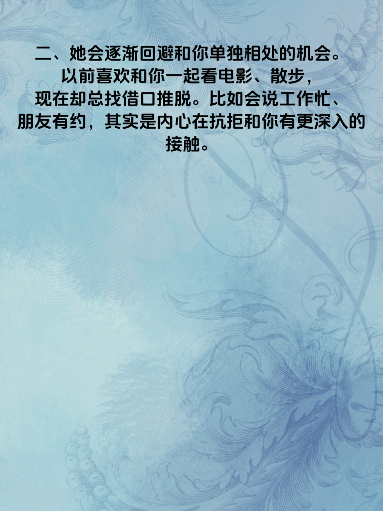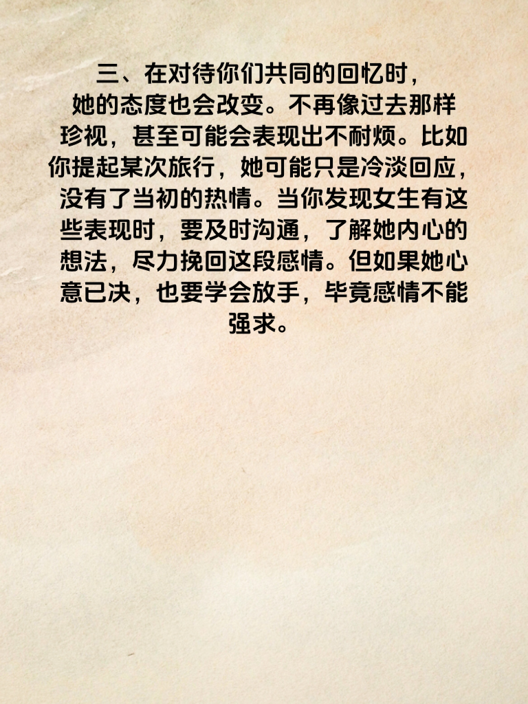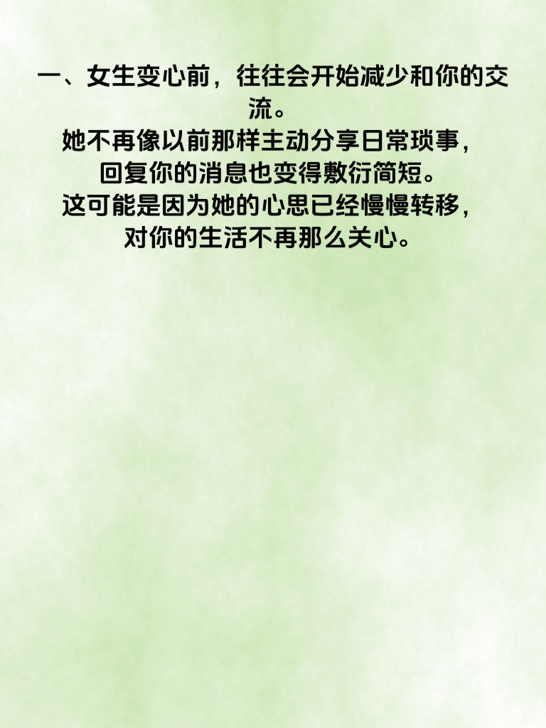 一、女生变心前,往往会开始减少和你的交流。她不再像以前那样主动分享日常琐事,回复你的消息也变得敷衍简短。这可能是因为她的心思已经慢慢转移,对你的生活不再那么关心。 二、她会逐渐回避和你单独相处的机会。以前喜欢和你一起看电影、散步,现在却总找借口推脱。比如会说工作忙、朋友有约,其实是内心在抗拒和你有更深入的接触。 三、在对待你们共同的回忆时,她的态度也会改变。不再像过去那样珍视,甚至可能会表现出不耐烦。比如你提起某次旅行,她可能只是冷淡回应,没有了当初的热情。当你发现女生有这些表现时,要及时沟通,了解她内心的想法,尽力挽回这段感情。但如果她心意已决,也要学会放手,毕竟感情不能强求。