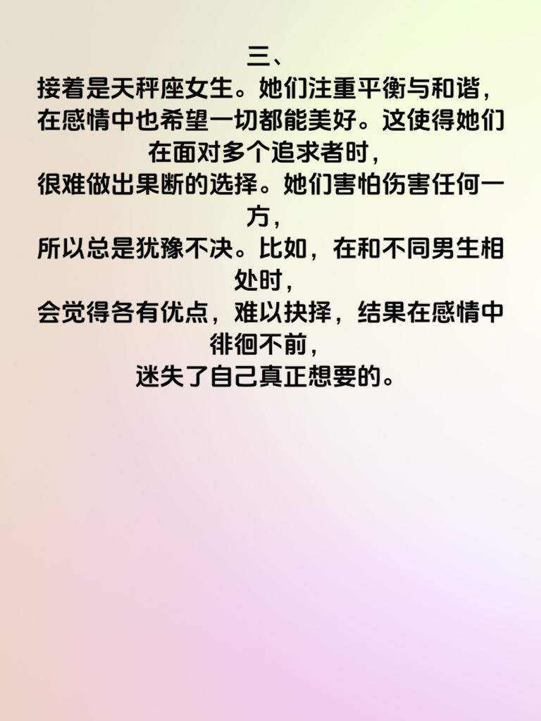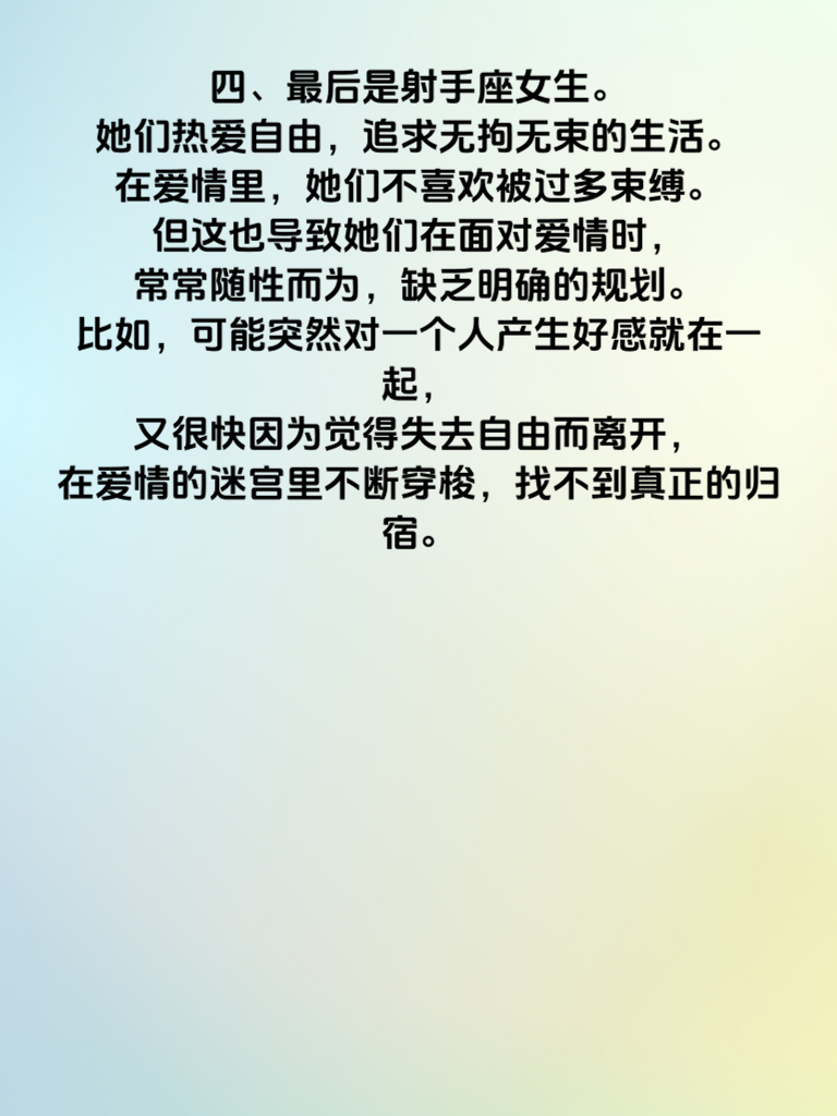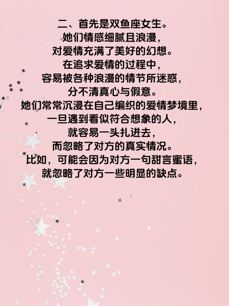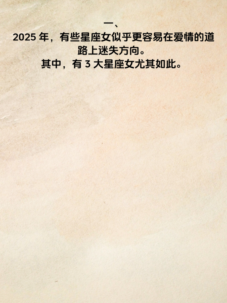 一、2025 年,有些星座女似乎更容易在爱情的道路上迷失方向。其中,有 3 大星座女尤其如此。 二、首先是双鱼座女生。她们情感细腻且浪漫,对爱情充满了美好的幻想。在追求爱情的过程中,容易被各种浪漫的情节所迷惑,分不清真心与假意。她们常常沉浸在自己编织的爱情梦境里,一旦遇到看似符合想象的人,就容易一头扎进去,而忽略了对方的真实情况。比如,可能会因为对方一句甜言蜜语,就忽略了对方一些明显的缺点。 三、接着是天秤座女生。她们注重平衡与和谐,在感情中也希望一切都能美好。这使得她们在面对多个追求者时,很难做出果断的选择。她们害怕伤害任何一方,所以总是犹豫不决。比如,在和不同男生相处时,会觉得各有优点,难以抉择,结果在感情中徘徊不前,迷失了自己真正想要的。 四、最后是射手座女生。她们热爱自由,追求无拘无束的生活。在爱情里,她们不喜欢被过多束缚。但这也导致她们在面对爱情时,常常随性而为,缺乏明确的规划。比如,可能突然对一个人产生好感就在一起,又很快因为觉得失去自由而离开,在爱情的迷宫里不断穿梭,找不到真正的归宿。
