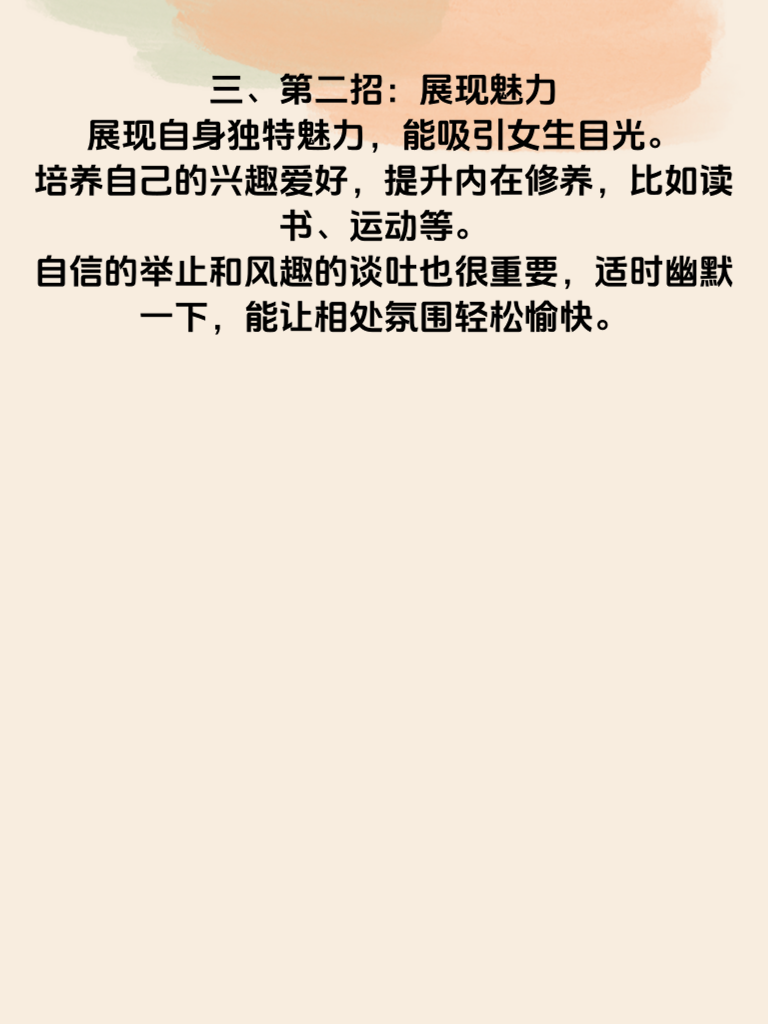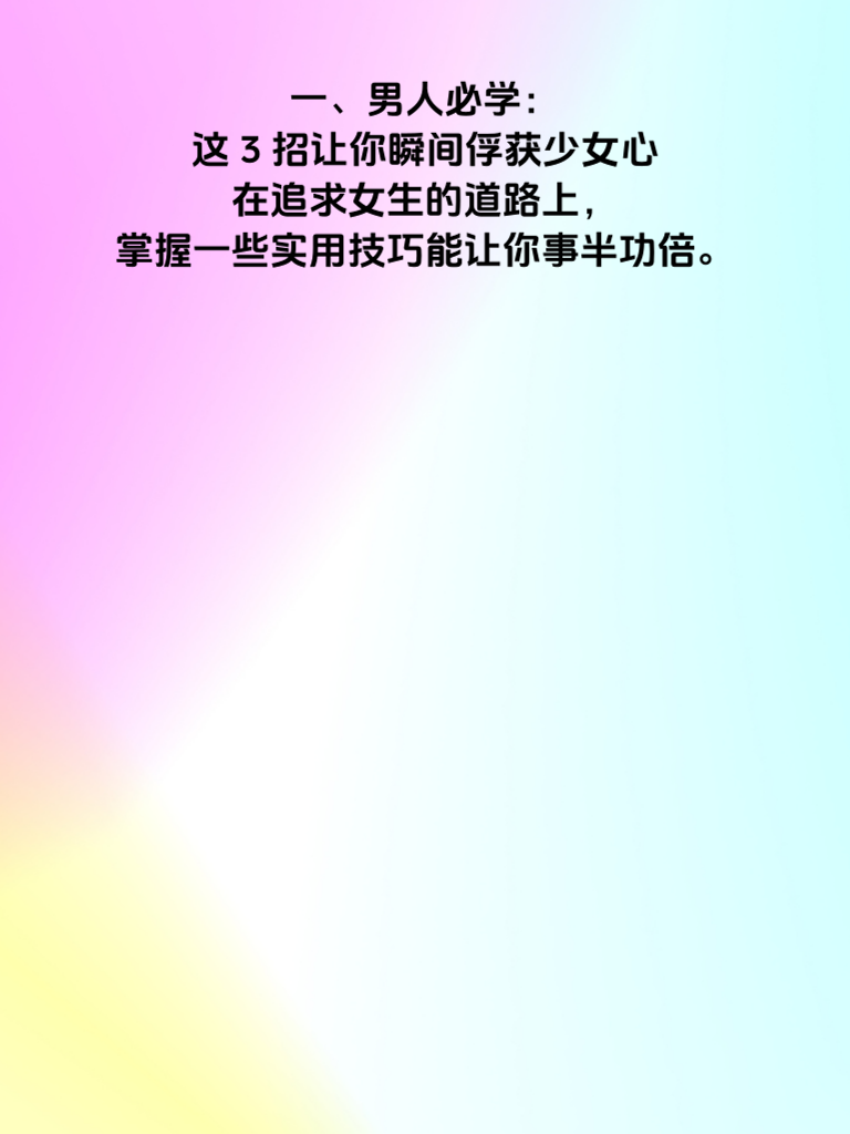 一、男人必学:这3招让你瞬间俘获少女心\n在追求女生的道路上,掌握一些实用技巧能让你事半功倍。\n 二、第一招:真诚至上\n真诚是打开女生心门的钥匙。不要虚情假意,真心对待她,让她感受到你的诚意。比如,记住她的喜好、生日等重要日子,用心准备小惊喜。真诚的关心和付出,会在她心中留下深刻印象。\n 三、第二招:展现魅力\n展现自身独特魅力能吸引女生目光。培养自己的兴趣爱好,提升内在修养,比如读书、运动等。自信的举止和风趣的谈吐也很重要,适时幽默一下,能让相处氛围轻松愉快。\n 四、第三招:尊重与理解\n尊重她的想法和感受,理解她的情绪。在她遇到困难时给予支持,在她开心时一起分享喜悦。尊重她的选择,不强迫她做不想做的事。做到这些,能让她对你产生好感,逐渐俘获她的少女心。