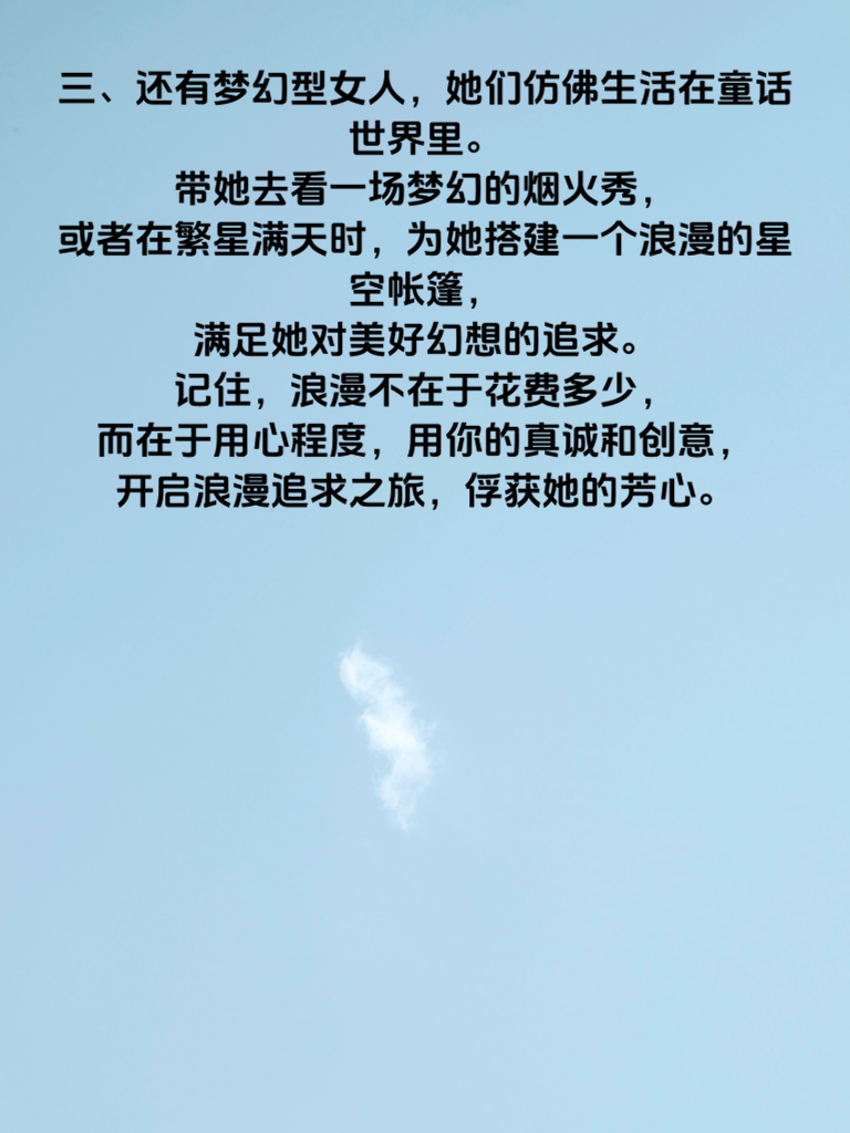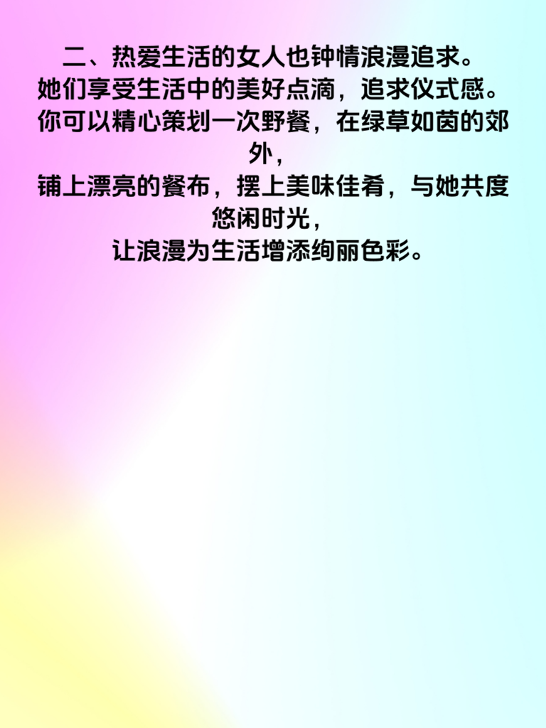 一、在追求女生的旅程中,了解哪种女人最爱浪漫追求至关重要。首先,文艺型女人对浪漫毫无抵抗力。她们内心细腻,充满诗意,浪漫能触动她们的心弦。比如,在月色如水的夜晚,为她准备一场专属的诗歌朗诵会,用温柔的声音诉说爱意,定能让她沉醉其中。 二、热爱生活的女人也钟情浪漫追求。她们享受生活中的美好点滴,追求仪式感。你可以精心策划一次野餐,在绿草如茵的郊外,铺上漂亮的餐布,摆上美味佳肴,与她共度悠闲时光,让浪漫为生活增添绚丽色彩。 三、还有梦幻型女人,她们仿佛生活在童话世界里。带她去看一场梦幻的烟火秀,或者在繁星满天时,为她搭建一个浪漫的星空帐篷,满足她对美好幻想的追求。记住,浪漫不在于花费多少,而在于用心程度,用你的真诚和创意,开启浪漫追求之旅,俘获她的芳心。