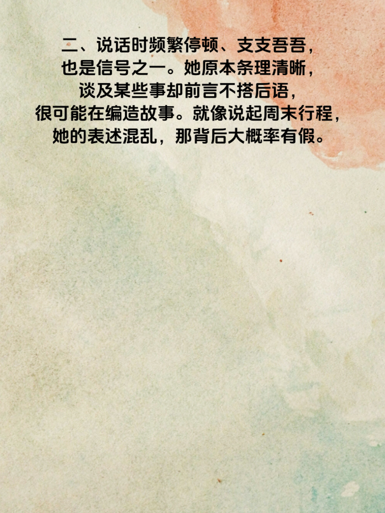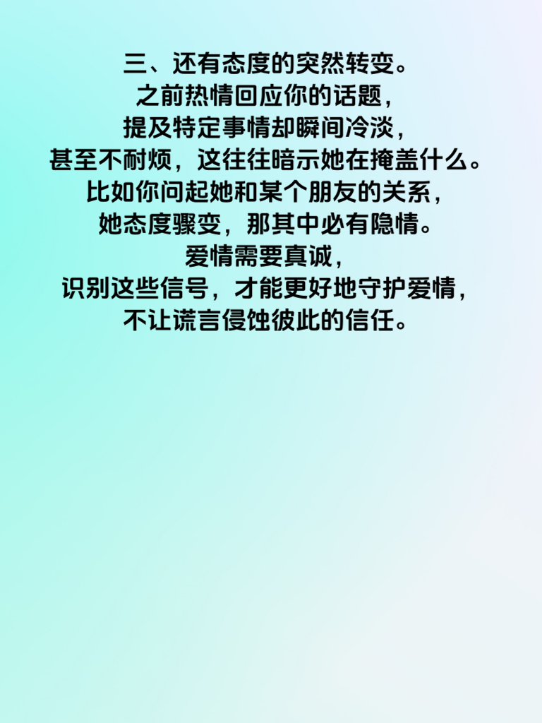 一、在爱情的世界里,了解女性撒谎的信号至关重要。当她眼神闪烁,不敢与你对视时,或许就藏着谎言。比如你们聊到某个重要日子,她突然眼神飘忽,可能她在这方面对你有所隐瞒。 二、说话时频繁停顿、支支吾吾也是信号之一。她原本条理清晰,谈及某些事却前言不搭后语,很可能在编造故事。就像说起周末行程,她的表述混乱,那背后大概率有假。 三、还有态度的突然转变。之前热情回应你的话题,提及特定事情却瞬间冷淡,甚至不耐烦,这往往暗示她在掩盖什么。比如你问起她和某个朋友的关系,她态度骤变,那其中必有隐情。爱情需要真诚,识别这些信号,才能更好地守护爱情,不让谎言侵蚀彼此的信任。