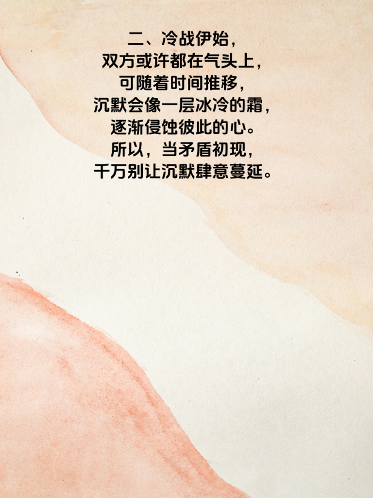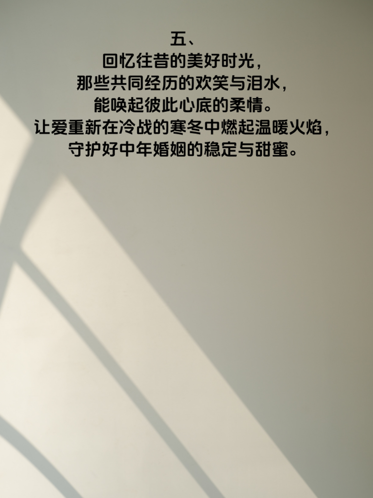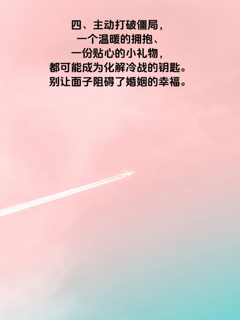 一、中年婚姻,如同行驶在岁月长河中的船只,平稳前行至关重要。冷战,往往是破坏这份平稳的暗礁。避免冷战3天以上,是维稳婚姻的关键课题。 二、冷战伊始,双方或许都在气头上,可随着时间推移,沉默会像一层冰冷的霜,逐渐侵蚀彼此的心。所以,当矛盾初现,千万别让沉默肆意蔓延。 三、要学会及时沟通,哪怕情绪激动,也试着用平和的语气表达感受与想法。比如,坦诚说出‘我现在心里有点堵,咱们聊聊’。 四、主动打破僵局,一个温暖的拥抱、一份贴心的小礼物,都可能成为化解冷战的钥匙。别让面子阻碍了婚姻的幸福。 五、回忆往昔的美好时光,那些共同经历的欢笑与泪水,能唤起彼此心底的柔情。让爱重新在冷战的寒冬中燃起温暖火焰,守护好中年婚姻的稳定与甜蜜。