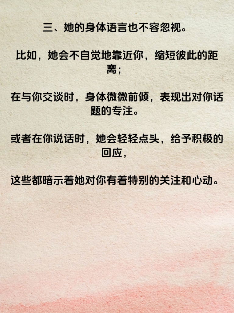 一、在男人追求女生的过程中,捕捉她心动的信号至关重要。一个不经意的眼神交汇,她眼中闪过的一丝光亮,可能就是心动的端倪。当她与你对视时,不再躲闪,而是略带羞涩又坚定地回望,那或许意味着她的内心泛起了涟漪。 二、她的笑容也是关键信号。如果她常常对着你露出灿烂、真诚且毫无保留的笑容,那很可能她已对你心生好感。这种笑容会在见到你时自然绽放,仿佛你就是她快乐的源泉。 三、她的身体语言也不容忽视。比如,她会不自觉地靠近你,缩短彼此的距离;在与你交谈时,身体微微前倾,表现出对你话题的专注。或者在你说话时,她会轻轻点头,给予积极的回应,这些都暗示着她对你有着特别的关注和心动。 四、还有她对你生活的关心。她会主动询问你的日常,对你遇到的事情表示关切,甚至会记住你不经意间提到的喜好。这表明她在用心走进你的世界,对你的情感也在不断升温。