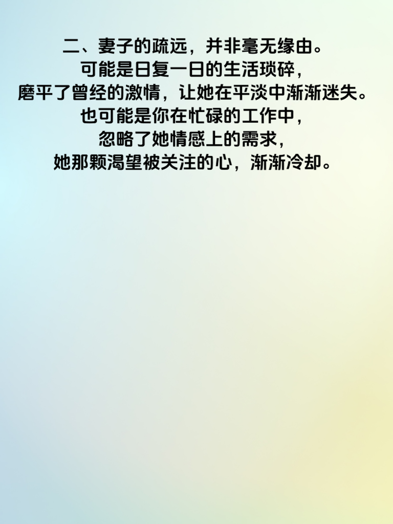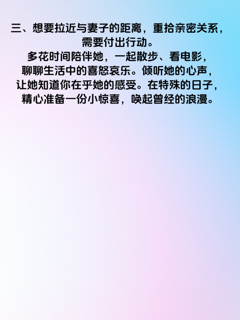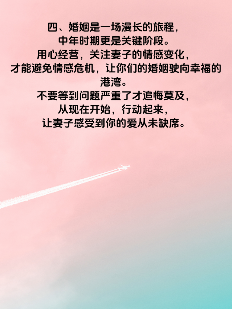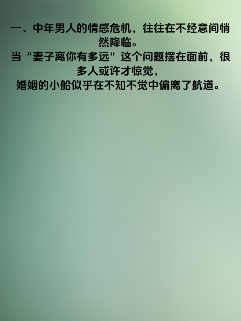 一、中年男人的情感危机,往往在不经意间悄然降临。当“妻子离你有多远”这个问题摆在面前,很多人或许才惊觉,婚姻的小船似乎在不知不觉中偏离了航道。 二、妻子的疏远,并非毫无缘由。可能是日复一日的生活琐碎,磨平了曾经的激情,让她在平淡中渐渐迷失。也可能是你在忙碌的工作中,忽略了她情感上的需求,她那颗渴望被关注的心,渐渐冷却。 三、想要拉近与妻子的距离,重拾亲密关系,需要付出行动。多花时间陪伴她,一起散步、看电影,聊聊生活中的喜怒哀乐。倾听她的心声,让她知道你在乎她的感受。在特殊的日子,精心准备一份小惊喜,唤起曾经的浪漫。 四、婚姻是一场漫长的旅程,中年时期更是关键阶段。用心经营,关注妻子的情感变化,才能避免情感危机,让你们的婚姻驶向幸福的港湾。不要等到问题严重了才追悔莫及,从现在开始,行动起来,让妻子感受到你的爱从未缺席。