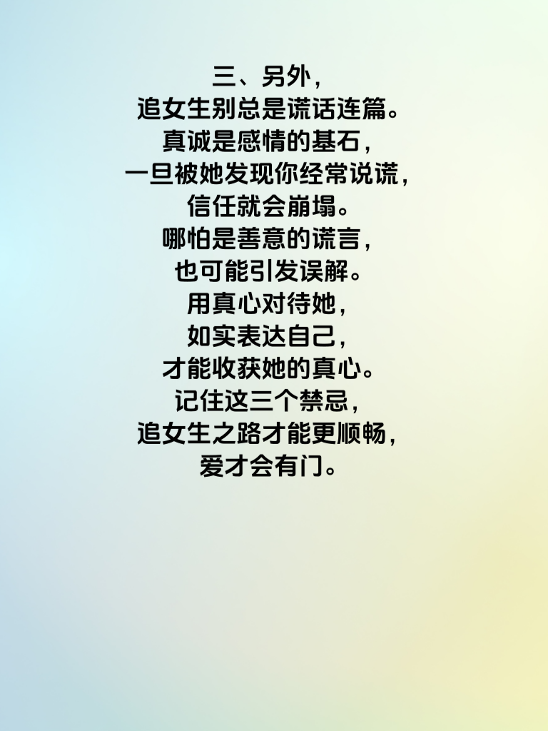 一、追女生时,切忌过度自我中心。有些男生一和女生聊天,就只说自己的事,兴趣爱好、工作成就,滔滔不绝,却不顾女生的反应。要知道,感情是双向的交流,多倾听她的想法、感受,关注她的生活点滴,才能走进她的内心。 二、还有,千万不要急于求成。刚认识没多久,就急着表白,给女生很大压力。感情需要慢慢培养,先从朋友做起,了解彼此,建立信任和默契。心急吃不了热豆腐,过早表白可能吓跑她。 三、另外,追女生别总是谎话连篇。真诚是感情的基石,一旦被她发现你经常说谎,信任就会崩塌。哪怕是善意的谎言,也可能引发误解。用真心对待她,如实表达自己,才能收获她的真心。记住这三个禁忌,追女生之路才能更顺畅,爱才会有门。