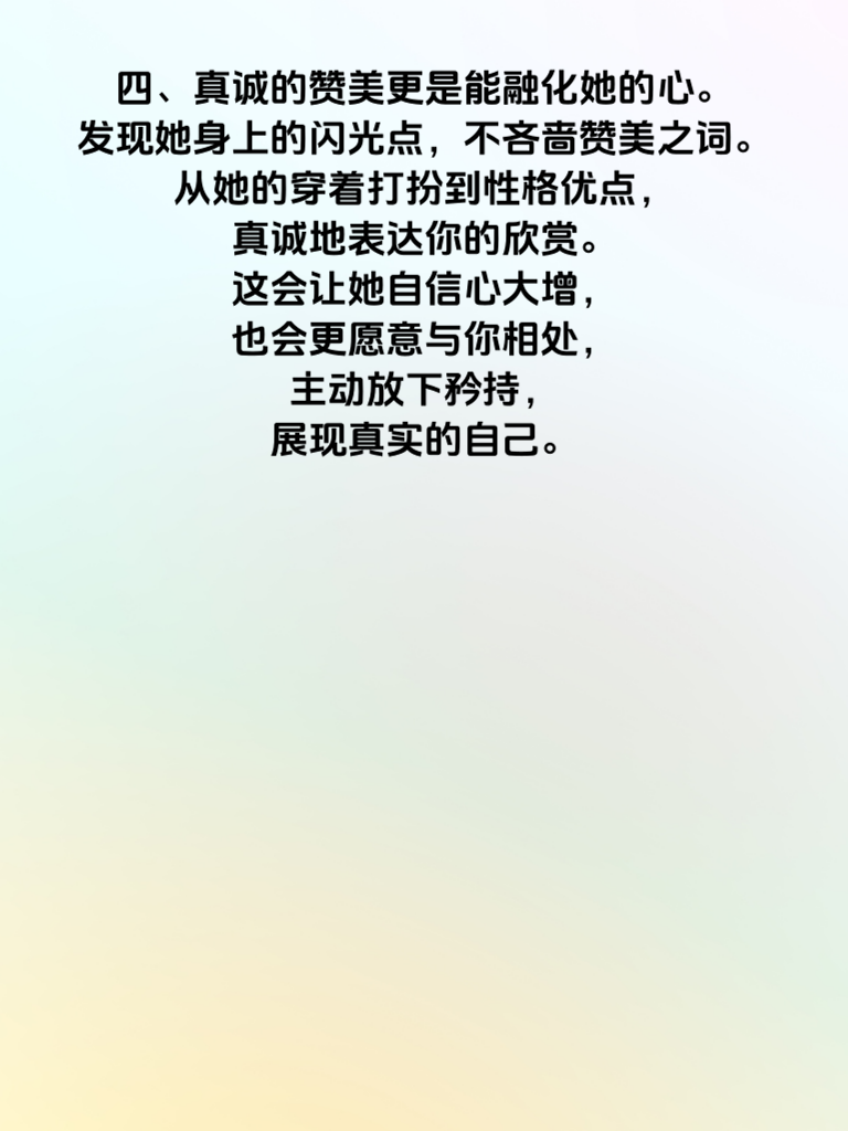 一、在追求女生的过程中,一些看似微不足道的细节,却能产生意想不到的效果,让她主动放下矜持。首先,注意倾听是关键。当她分享生活中的点滴时,专注地聆听,用眼神给予回应,适时点头表示理解。这会让她感受到你对她的尊重与在乎,从而拉近你们的距离。 二、贴心的小举动也必不可少。比如,在天气变化时提醒她增减衣物;她生病时,送上关心和温暖的问候。这些看似平常的细节,却能在她心中种下感动的种子,让她对你渐渐敞开心扉。 三、尊重她的兴趣爱好同样重要。了解她喜欢的事物,陪她一起参与相关活动。无论是看一场她心仪的电影,还是去她喜欢的餐厅用餐,都能让她觉得你们有共同的话题和乐趣,进而放下防备,与你更亲近。 四、真诚的赞美更是能融化她的心。发现她身上的闪光点,不吝啬赞美之词。从她的穿着打扮到性格优点,真诚地表达你的欣赏。这会让她自信心大增,也会更愿意与你相处,主动放下矜持,展现真实的自己。