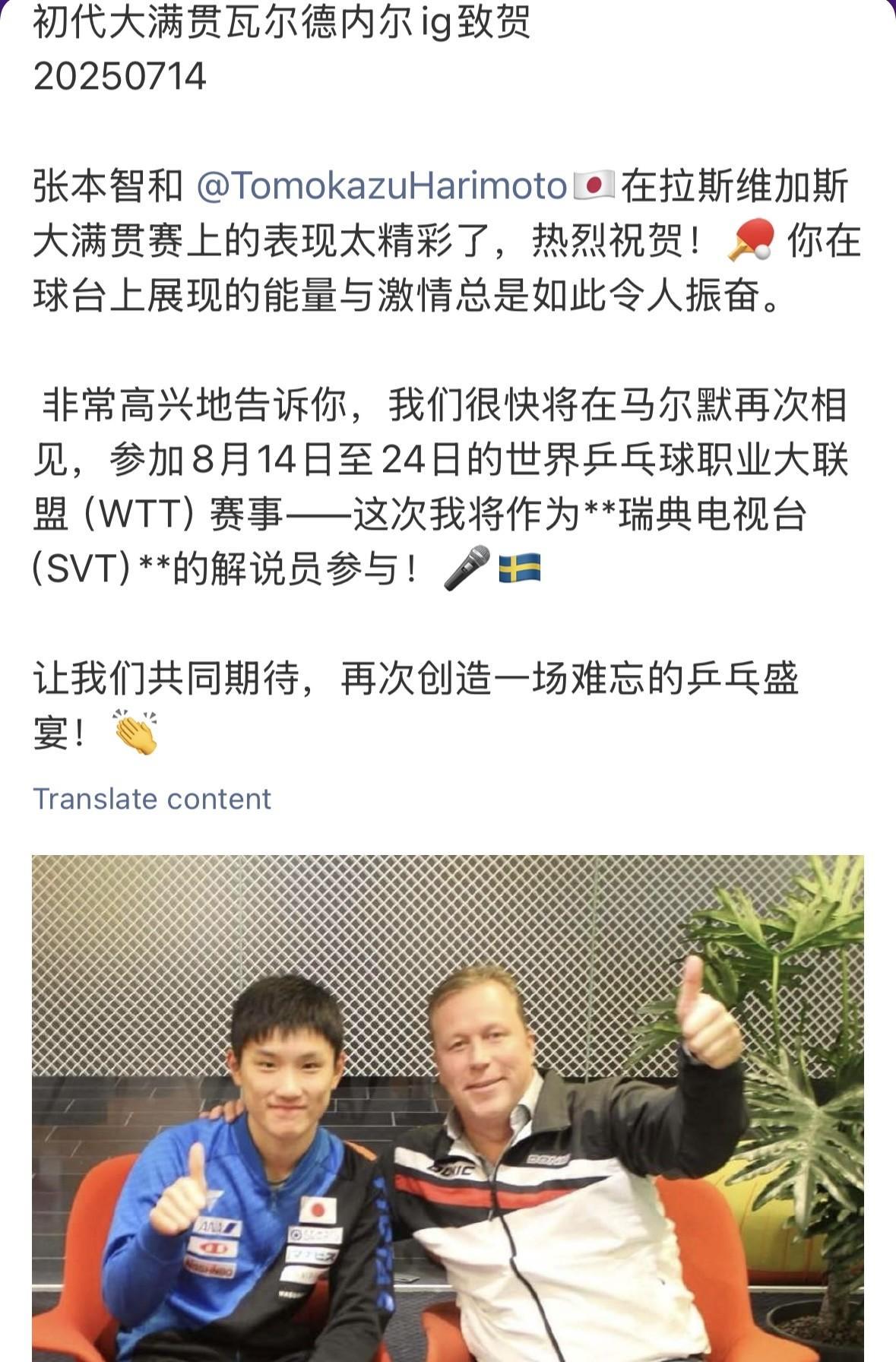 马尔默市政府迫不及待地分享了瑞典大满贯场馆的照片:入口宣传海报,仍然是孙颖莎、莫雷加德打头阵,张本智和、申裕斌紧随其后。 无论WTT在地球的哪个角落举行,孙颖莎必然会被各个国家放在最好的位置。 横滨冠军赛,日本最终对外展示的大海报,上面只有两个人:孙颖莎、张本智和。 这两个人也不负所托,孙颖莎在日本主场一串二,桥本帆乃香、大藤沙月是本周期最有冲劲的生面孔。 而这两个人加起来在孙颖莎手里加起来只拿了一局,也让日本女乒的格局继续保持了一团迷雾:姐妹们,你们都有机会哈。有孙颖莎在,你们谁上,都从铜牌开始竞争。 张本智和,倒是时隔八年,依然意气风发。 八年前,14岁的张本智和在日本公开赛,一串三,周雨、马龙、张继科全部倒在他拍下,就此拿下白金赛事男单冠军,世界排名冲入前十,这项最年轻的世界前十记录从未被人打破过。 八年后,22岁的张本智和在横滨冠军赛,一串二,向鹏、王楚钦双双以同样的比分4:2倒在拍下,张本智和主场登顶。 而乒坛第一个Goat瓦尔德内尔看完美国大满贯,就已经在期待老朋友张本智和的到来。 瑞典唯一举棋不定的人选,是在张本美和VS申裕斌中间。他们中间的几版海报,用了爱笑女孩张本美和,后来又可能被爱笑申裕斌打动。 纠结来纠结去,换了一版版,张本美和、申裕斌轮流坐桩,最后还是在场馆门口放了申裕斌。 泪目,瑞典耗费了大量精力纠结我到底是选美和好,还是裕斌好,结果版面四个人,最后就剩一个瑞典人了[笑哭]