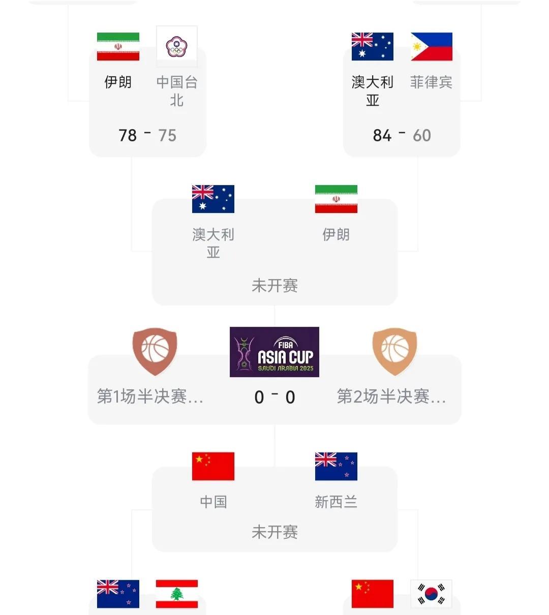 8月16日21点,男篮亚洲杯半决赛,中国对阵新西兰,澳大利亚对阵伊朗。在1/4决赛中,中国79-71韩国、伊朗78-75中国台北、新西兰90-86黎巴嫩、澳大利亚80-64菲律宾。