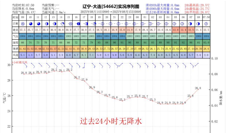 昨日官方预报:大连8月14日白天到夜间多云间晴,瓦房店普兰店庄河多云白天有分散性阵雨,有雾,偏南风4到5级,最高气温:31℃,最低气温:24℃。实况:晴间多云,局部有雾,最高气温:29.5℃,最低气温:24.7℃,平均气温:26.8℃,空气质量:良,AQI平均:74。