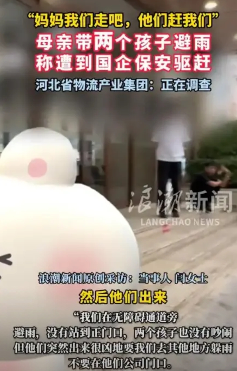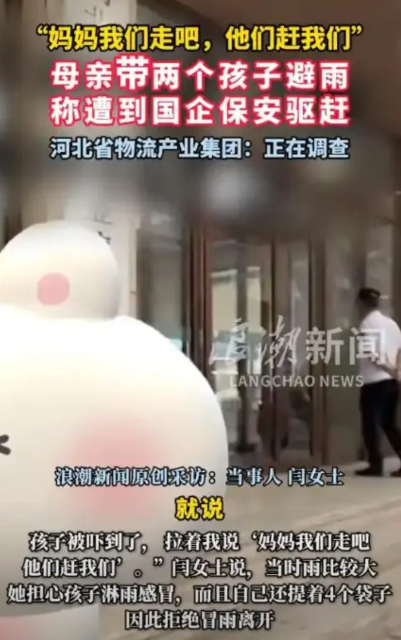 “心比雨冷!”河北石家庄,女子带孩子出门,路上刚好赶上下大雨,就找了一家国企门前避避雨,不料,还没等两分钟,就遭到大厅保安及一名管理人员的驱赶,而且对方态度恶劣,这也引起了女子的吐槽和不满! 八月中旬的石家庄,一场暴雨毫无征兆地泼了下来。 闫女士带着两个孩子走在路上,大的十岁,小的八岁,手里还提着四个行李袋。 雨点砸在地上溅起水花,大人还能咬牙扛着,可孩子在雨里直打哆嗦。 不远处就是河北省物流产业集团的大楼,她看见无障碍通道旁边有块能遮雨的地方,赶紧带着孩子躲过去。 她们缩在角落,没挡住大门,也没出声,就想等雨小点儿再走。 还没待够十分钟,大楼里出来了保安和一名工作人员,直奔她们而来。 对方说话的口气很冲,像是在训斥人,让她们马上离开,说公司门口不准停留。 闫女士赶紧解释,说雨太大,孩子受不了,就躲几分钟,雨小了立刻走。 可对方根本不听,态度一点儿没松。 两个孩子看着妈妈被这样对待,拉着闫女士的衣角说要走。 闫女士看着瓢泼大雨,又看看哭着的孩子,心里不是滋味。 后来趁着雨稍微小了点,她只好带着孩子和行李,重新走进雨里。 这事被发到网上后,好多人都在讨论。 河北省物流产业集团回应说,公司没有禁止避雨的规定,闫女士避雨的地方是公共空间,她的做法合理,现在正在内部核查。 但没说什么时候能有结果,也没提保安和工作人员的行为算不算违规,该怎么处理。 其实类似的事不是第一次发生。 2023年六月中旬,深圳也有网友发视频,说招商蛇口邮轮母港的保安,把在门口避雨吃饭的工人赶走了。 视频里,一群工人坐在公司外侧的空地上,一边躲雨一边吃饭,保安过来让他们走,有个工人还跟保安说了几句话,还有几个人起身提着饭准备离开。 拍视频的韦先生也是个工人,他说当时看到这一幕就拍了下来,清楚听见保安不让在这儿吃饭,但不知道为啥。 后来公司工作人员说,已经接到反映,记下来反馈给相关部门了,也问过反映情况的人具体信息,就是还没收到对方给的视频。 公司还说,没有明文规定不让在门口躲雨,现在也说不清当时保安是不是在驱赶,为啥要赶人,这些都得再核实。 接下来会查监控,问问当天值班的部门,弄清楚到底咋回事,有结果了会告诉反映情况的人。 这两件事放在一起看,有点像。 都是有人在企业门口避雨,都被保安赶了,涉事企业都说没有禁止避雨的规定。 但细究起来,差别也挺明显。 河北这边是带孩子的妈妈,深圳那边是一群工人,而且工人当时还在吃饭,河北的驱赶让孩子受了惊吓,深圳那边更多是言语上的冲突。 企业回应的时候,河北直接说允许避雨,深圳则说得更含糊,说还不能下结论。 其实大家争论的,说到底是在公共场所能不能安心避雨。 企业门口、通道这些地方,到底算不算公共空间? 普通人临时躲个雨,没妨碍别人,到底该不该被赶? 私人公司遇到这种事,大家可能还不会说太多,毕竟是人家自己的地方。 再说了,就算公司真没规定不让避雨,保安为啥会赶人? 可能是内部有没写出来的规矩,也可能是保安自己把“维持秩序”理解得太死板了。 不管是哪种情况,企业平时对员工的培训,恐怕都少了点对人的体谅。 就像河北这次,妈妈带着孩子在大雨里找个角落躲一躲,本是很平常的事。 保安哪怕态度缓和点,说句“雨小了就赶紧走”,可能结果就完全不一样。 可偏偏用了最硬的方式,不光让当事人心寒,也让看了这事的人觉得不舒服。 说到底,避雨这事不大,可处理不好,就容易让人觉得,有些地方少了点该有的温度。 信息来源: 九派新闻2025-08-13《女子称雨天在一企业大厅避雨遭驱赶,涉事集团:大厅允许路人避雨,正在调查核实》