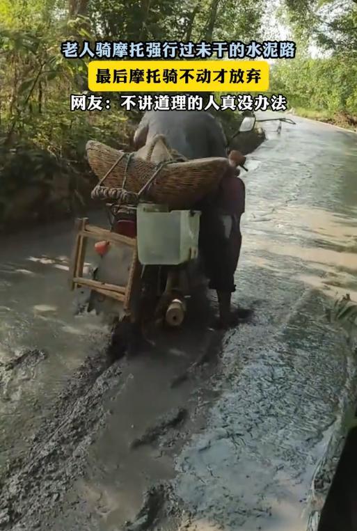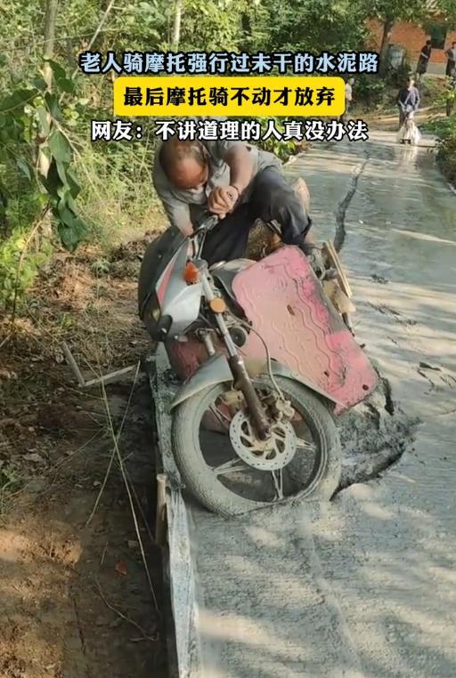 “太缺德了!”8月14日,湖北襄阳,一老人骑摩托车路过刚浇筑好的水泥路,突然掉转车头开了上去,工人见状急忙上前阻拦,可老人丝毫不听,自顾自的往前开,直到摩托车陷进水泥骑不动才停下!工人无奈只能返工修复。网友:让他赔偿损失! 村里面修路,本应该是件好事,可没想到却有人故意使坏,实在是太没有素质了。 这天,十几名工人在村里忙前忙后,终于将数百米的水泥路面浇筑完毕,接下来就是等待它变干。 就在这时,传来一阵摩托车的引擎声,一位大爷骑着摩托车慢悠悠的经过,工人告诉大爷这边正在修路,让他绕一绕。 可大爷仿佛没有听见一样,还是拐了过来,打算在水泥浆中骑行。 工人们连忙喊停大爷,想要阻止他,可大爷却一拧油门,打算强行冲过去,最终骑了大约100米,车轮彻底转不动了,大爷这才停下车来。 工人虽然生气,但是对于这种上了年纪的人也不敢真动手,说了几句后就再次返工,只能自认倒霉。 网友看后表示,这种老人真是太可恶了,仗着自己年纪大了就为所欲为,全然不把别人的劳动成果放在眼里,既然不能动手,那就报警让警察惩罚他! 大家对于这件事是怎么看? 信息来源:《大爷路过刚浇筑的水泥路,不顾劝阻执意骑摩托车碾压百米路面》大象新闻