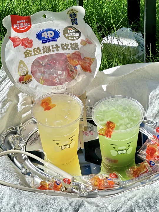 🌈羽衣甘蓝➕阿麦斯的小金鱼软糖➕气泡水!!!小金鱼在气泡水里活灵活现地游泳,一整个清爽住了!!喝上一口尊滴巨巨巨解腻!!