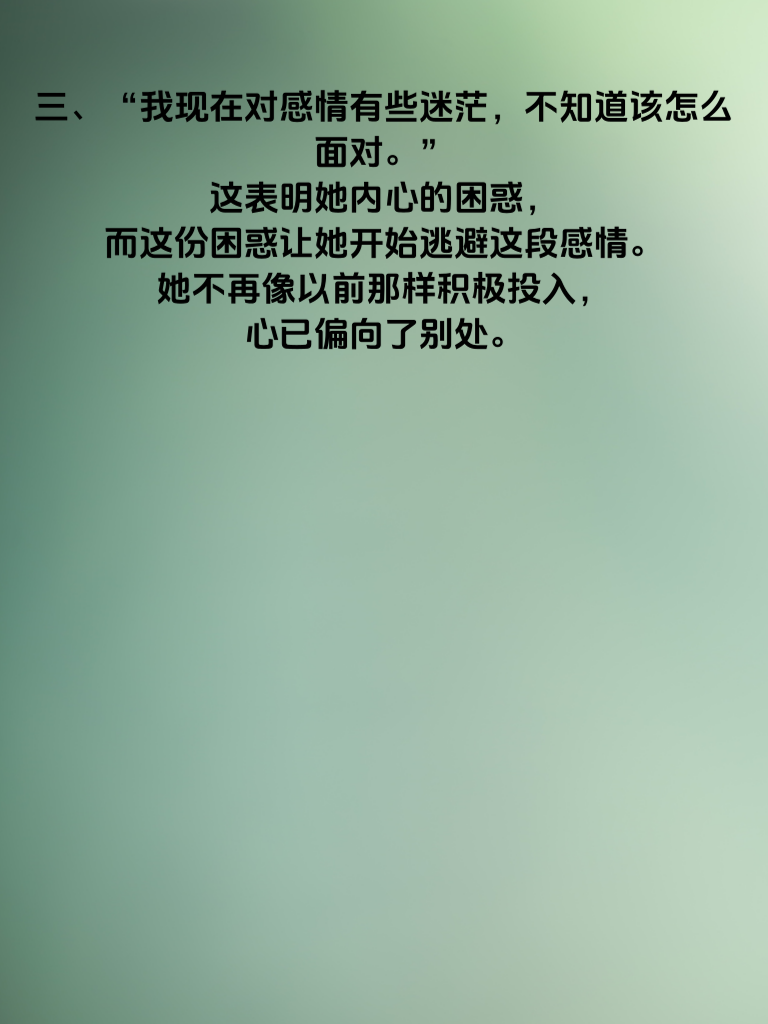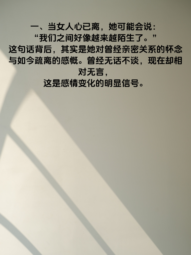 一、当女人心已离,她可能会说:“我们之间好像越来越陌生了。”这句话背后,其实是她对曾经亲密关系的怀念与如今疏离的感慨。曾经无话不谈,现在却相对无言,这是感情变化的明显信号。 二、“我觉得我们的未来规划不到一起。”女人说出这话,意味着她对这段感情的长远发展失去了信心。她看不到与你携手前行的方向,心也就慢慢远离了。 三、“我现在对感情有些迷茫,不知道该怎么面对。”这表明她内心的困惑,而这份困惑让她开始逃避这段感情。她不再像以前那样积极投入,心已偏向了别处。 四、“我好像找不到当初那种心动的感觉了。”感情中,心动是很重要的元素。当她说出这句,说明她在这段感情里已经感受不到激情,心自然也就渐行渐远。男生们若听到女人说这四句话,就得好好反思这段感情,看看问题出在哪里,及时做出改变,或许还能挽回她的心。
