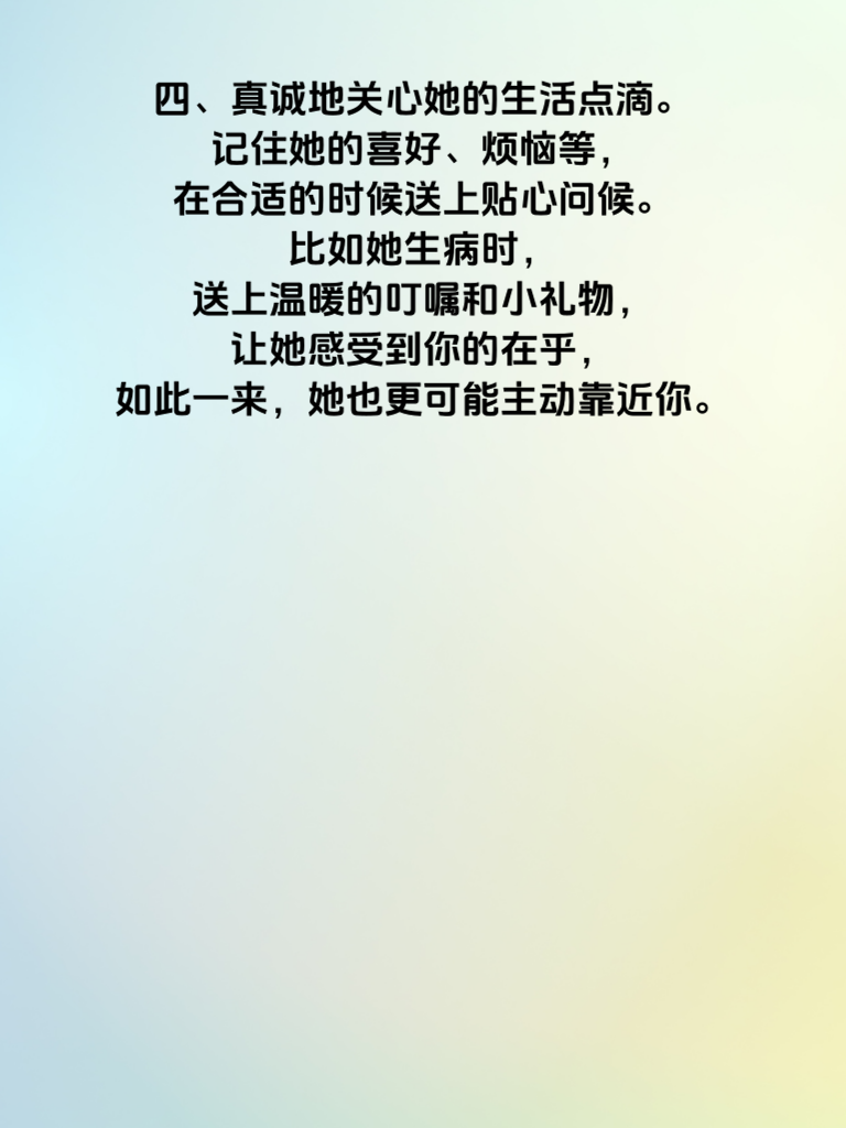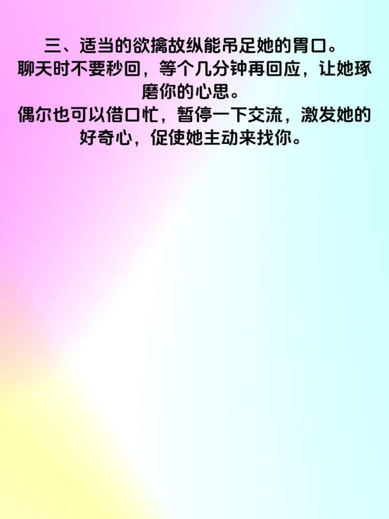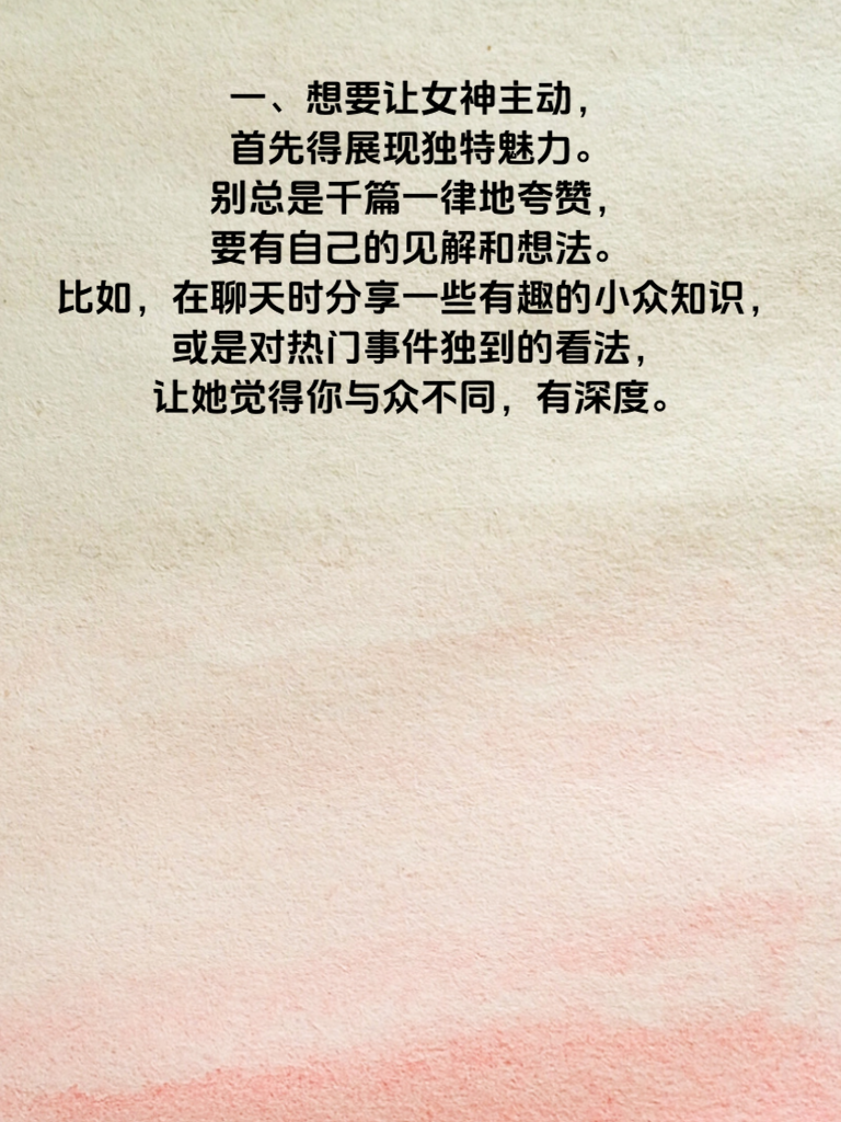 一、想要让女神主动,首先得展现独特魅力。别总是千篇一律地夸赞,要有自己的见解和想法。比如,在聊天时分享一些有趣的小众知识,或是对热门事件独到的看法,让她觉得你与众不同,有深度。 二、制造不经意的偶遇也是个妙招。多去她常出没的地方,像是图书馆、咖啡店等。每次相遇,微笑点头,简单打个招呼,慢慢刷脸熟。但注意别太刻意,不然会适得其反。 三、适当的欲擒故纵能吊足她的胃口。聊天时不要秒回,等个几分钟再回应,让她琢磨你的心思。偶尔也可以借口忙,暂停一下交流,激发她的好奇心,促使她主动来找你。 四、真诚地关心她的生活点滴。记住她的喜好、烦恼等,在合适的时候送上贴心问候。比如她生病时,送上温暖的叮嘱和小礼物,让她感受到你的在乎,如此一来,她也更可能主动靠近你。