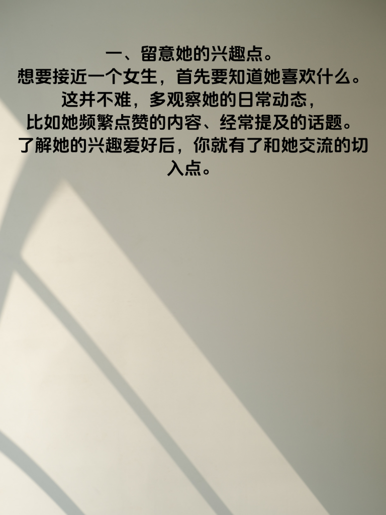 一、留意她的兴趣点。想要接近一个女生,首先要知道她喜欢什么。这并不难,多观察她的日常动态,比如她频繁点赞的内容、经常提及的话题。了解她的兴趣爱好后,你就有了和她交流的切入点。 二、寻找共同交集。有了兴趣点这个基础,接着要找和她的共同交集。可以是共同的朋友、共同参与的活动,或者是都感兴趣的某个场所。通过这个交集,自然地出现在她身边,开启交流。 三、真诚地展开交流。交流时一定要真诚,不要虚情假意。从她感兴趣的话题入手,倾听她的想法,分享你的观点。让她感受到你是真的在关心她、理解她,而不是为了敷衍而聊天。 四、适时展示自身优点。在交流过程中,要适时展示自己的优点,但不要刻意吹嘘。比如你的才华、你的责任心、你的善良等。让她看到你的闪光点,从而对你产生好感,进一步拉近你们之间的距离。